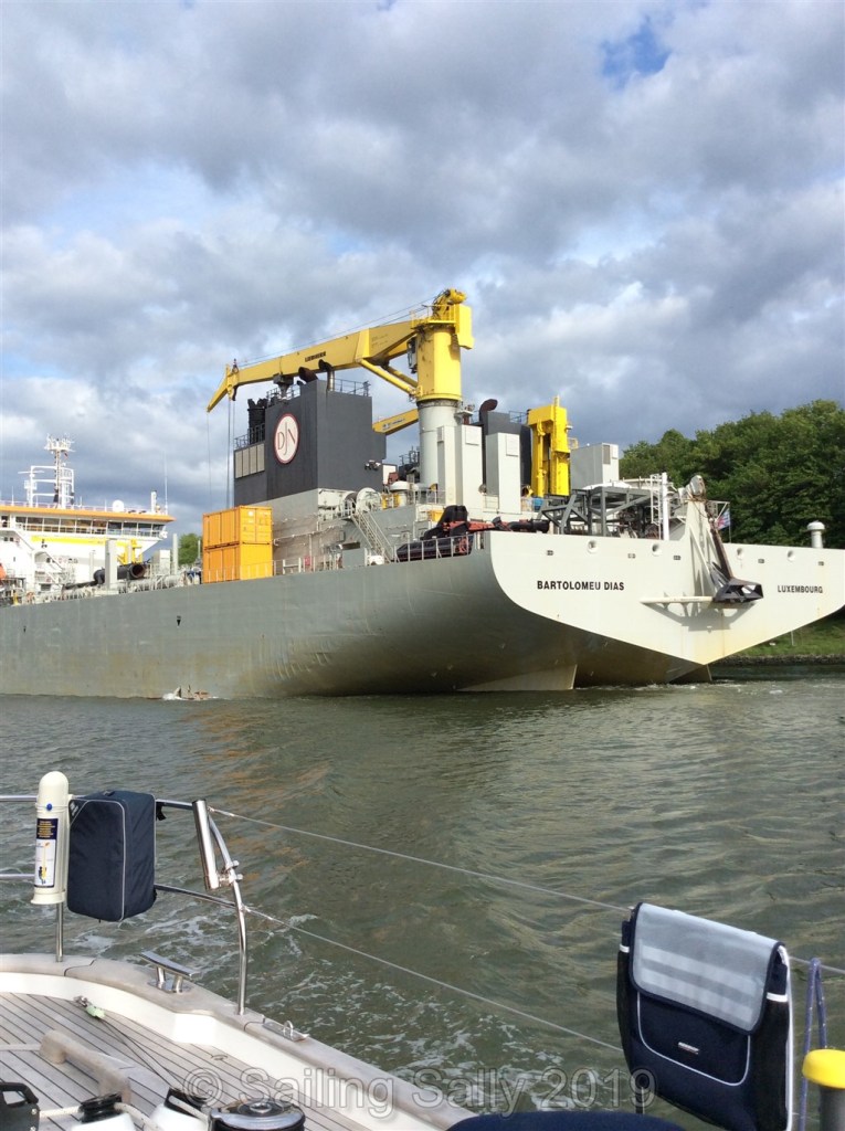 Even though the cargo boat was not very big, we felt very small. But everything went well and we came out of the lock unscathed and into the canal.