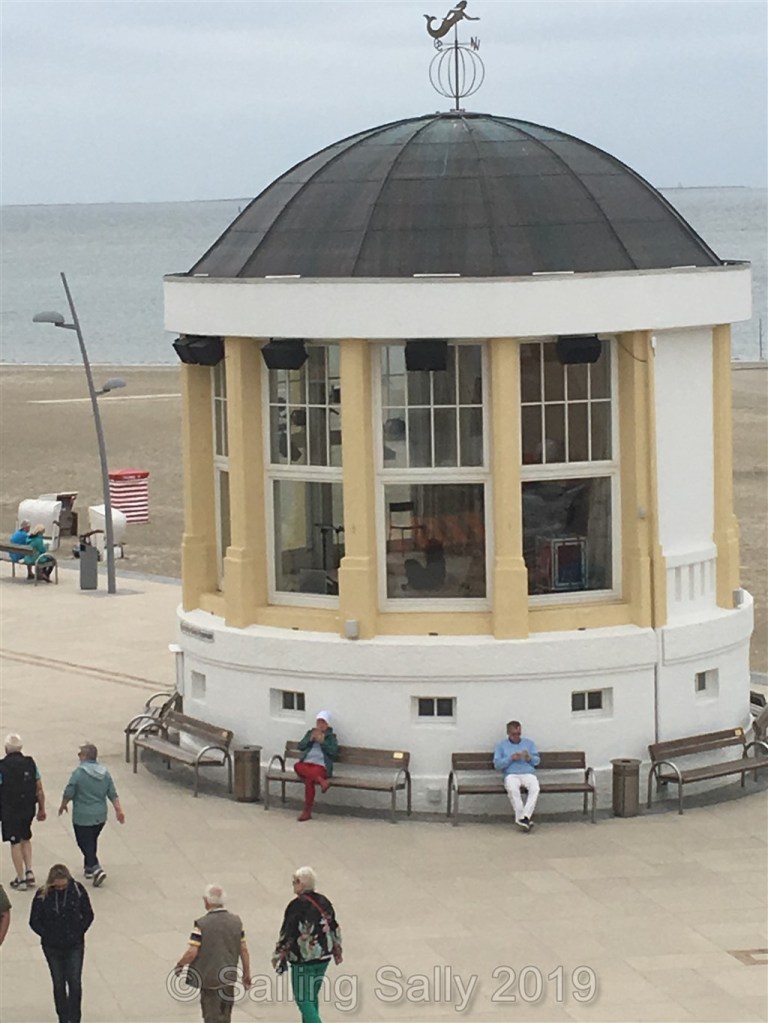 Vi tror det är ett konserthus i miniatyr. Vi ser bara notställ, stolar och högtalare i huset, och flera högtalare utanpå riktade mot strandpromenaden. Fin idé i vilket fall.