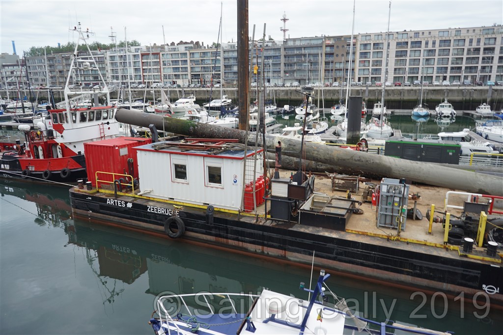 Nästa dag kom de tillbaka och tog upp stolparna som u-båten har varit förtöjd i. De fäste någon sorts hydraulmaskin som skakade loss stolpen och med lyftkranens hjälp lyfte de upp stolpen och la den på däcket.