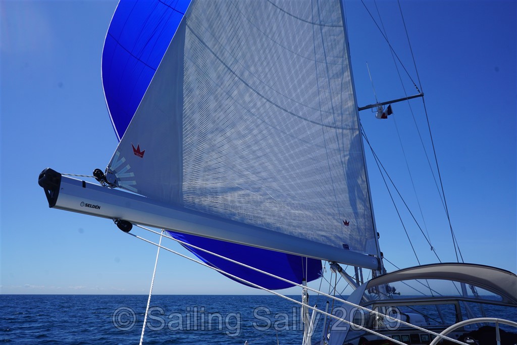 Vi lämnar Boulogne vid 8-tiden. Solen skiner och vi har en lätt medvind på 3 -4 m/s, så vi beslutar att hissa vår nya gennaker för första gången. Vi har aldrig haft ett så stort segel (140kvm) till någon av våra båtar tidigare, så vädret är perfekt nu för oss nybörjare. Allt går hur bra som helst, strumpan åker lätt upp och seglet ut. Lite förenklat så ligger seglet i en lång korv ”strumpan” där man hissar upp den ena änden till toppen på masten. Sen drar man strumpan uppåt och seglet åker ut. När man vill ta ner så drar man ner strumpan över seglet igen och hissar lätt ner ”korven” igen.
