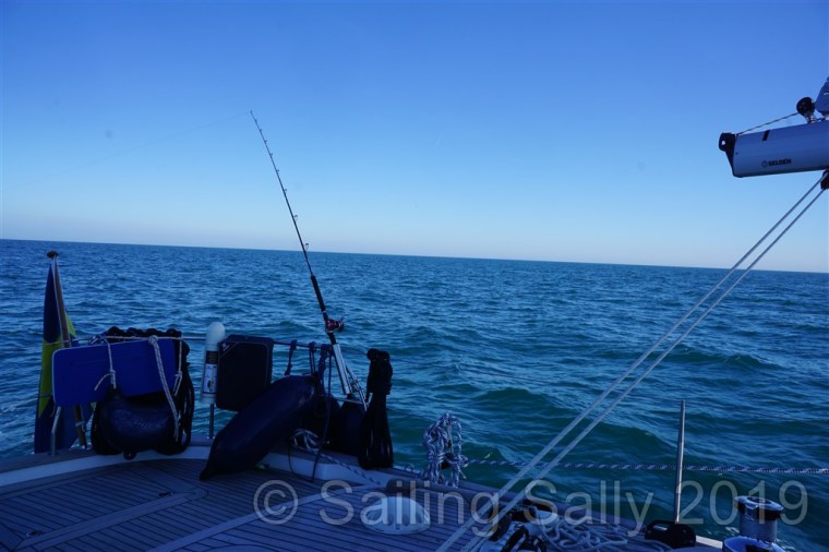 Dagens och nattens segling blir så nära perfekt det kan bli. Lätt vind, inga vågor, och medströms mestadels så båten far fram i runt 8 knop. Inte hela tiden förstås, men väldigt länge. Motorn bara igång ett par timmar totalt. Vi provar även fiskelyckan för första gången, men tyvärr, ingen fångst.