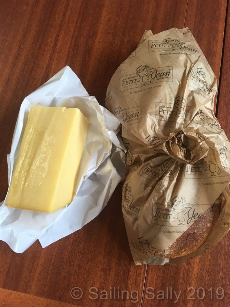 Affärsinnehavaren måste ha tyckt vi köpte en gigantisk bit ost. I den fina inslagningen ligger ett gott bröd från bageriet.