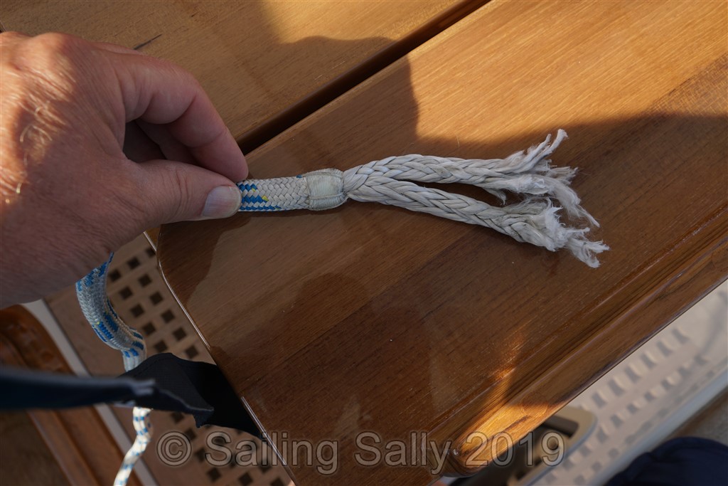 It was a tricky rope to splice, it contain two cover layers over the core and I’m not sure I got it it right, the loop does only contain the core, not the inner cover.