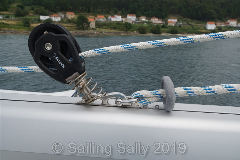 Use another type of shackle that won’t scratch the boom when furling the main. This one is not fixed, I have mounted the shackle so that it won’t shred the rope. Maybe it’s possible to use a shackle without that part sticking out on one side, don’t know the English name for it.
