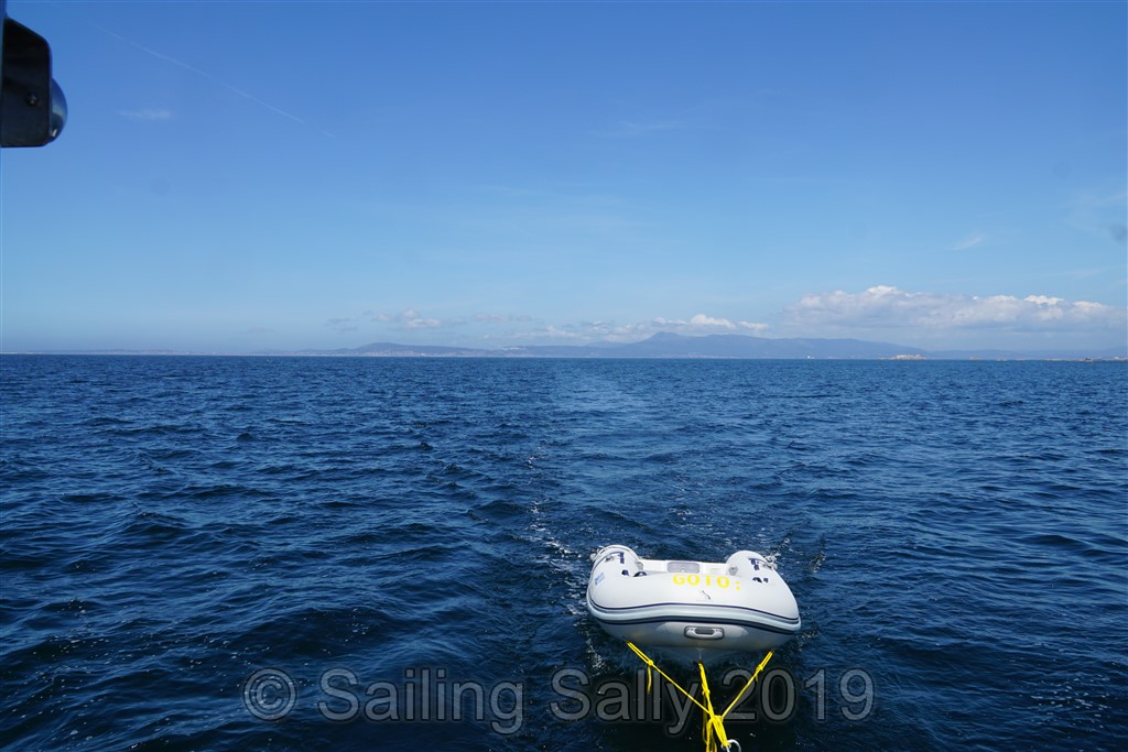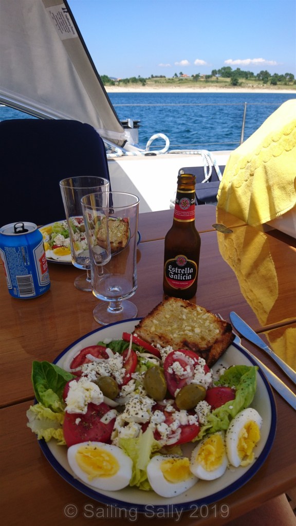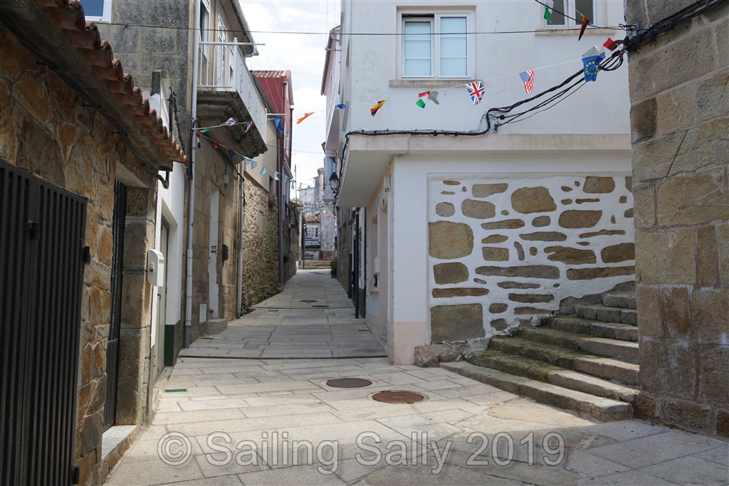 Vi åker aldrig in till stranden, alldeles för mycket folk, men tar en tur längs kusten och in till Cangas som ligger ca 5 distans bort. Tur vi satsade på en stark motor till jollen som snabbt och enkelt kan ta oss så långt. Även när det blåser lite motvind och vågorna är stora för en liten jolle. Hittar en bra plats till jollen, äter musslor och bläckfisk ( igen 🙂 ) och går en promenad runt stan.