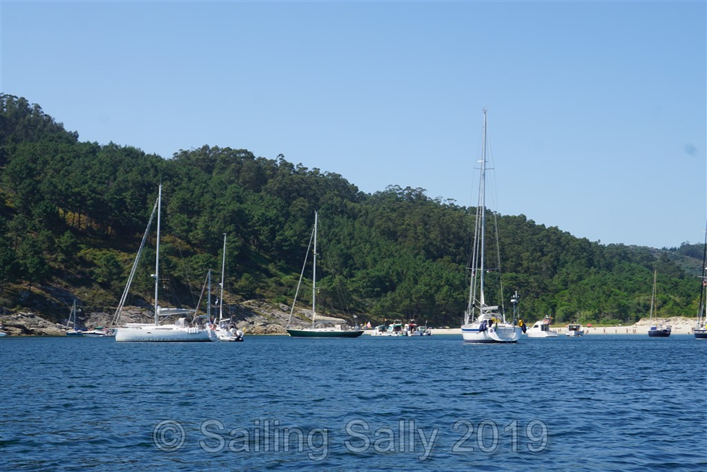 Nästa ria blir Ria de Vigo, där vi lägger till utanför stranden Praia de Barra. Det visar sig vara en nudiststrand och de flesta är nakna även på sina båtar. Så även vi förstås, måste ju bättra på den obefintliga solbrännan på hela kroppen.