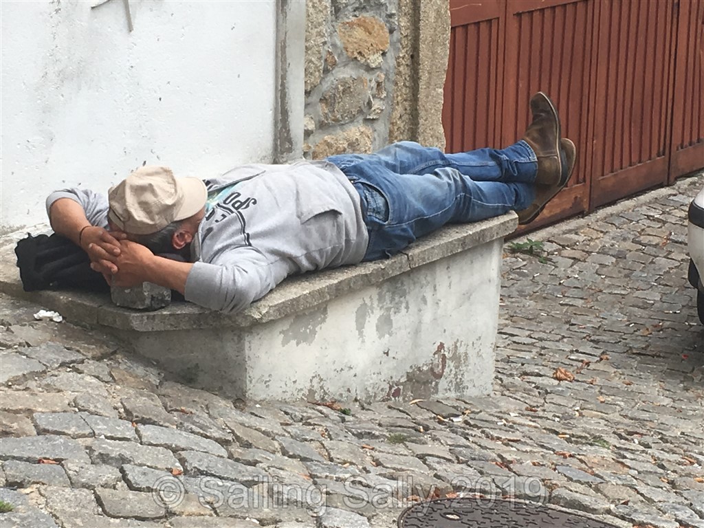 En liten middagsslummer är aldrig fel, även om det såg lite hårt ut. På bänken utanför entrén till Churchill´s