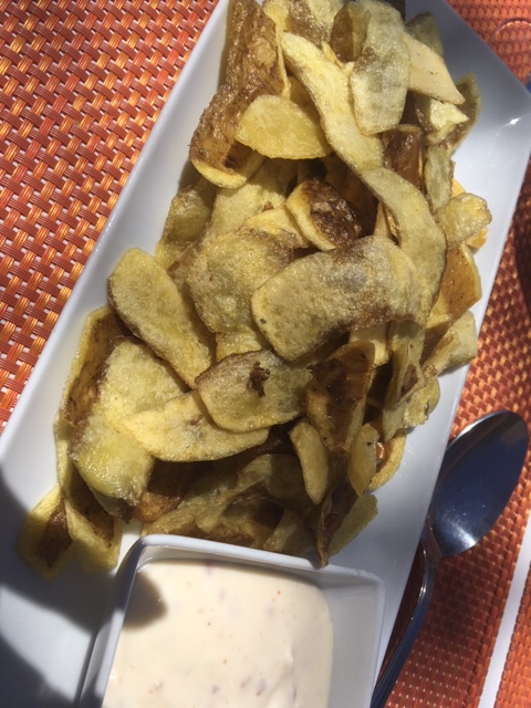 Det händer ganska ofta att jag väljer sånt jag inte riktigt vet vad det är på menyer, vill ju inte missa något nytt som kan vara gott. Provar gärna lokala specialiteter. Ibland blir det toppen …..och ibland botten. Den här gången ser jag något på menyn med potatis och aioli. Ska bli spännande att se vad de gör av det, potatis låter som ett ganska säkert kort ändå. In kommer…..potatisskal, lätt friterade 🙂 Jonas ser mycket nöjd ut med sitt säkra kort, en gazpachosoppa. Men kreativt och bra miljötänk tänker jag, bättre än att slänga, och gott var det.