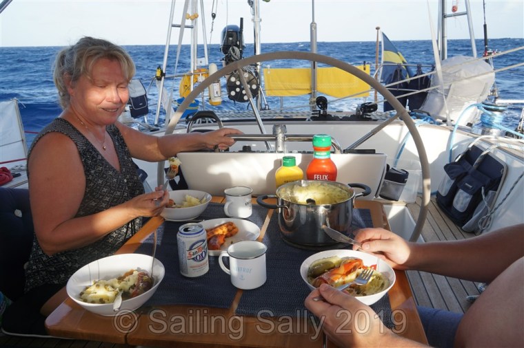 Each morning there are one or more dead flying fishes on the deck. They never hit the boat in daylight so I think they can see something when above water and control where to go. Tomorrow we will pass the waypoint named Halfway on our plotter. I Think Carina has prepared something to celebrate it. Now we have less wind than yesterday which is good, but the swell coming from the north causes severe roll when a train of swell passes by every 30 seconds or so. When thinking about it, there is always something that is not perfect when sailing, too light wind, too hard wind, wind from the wrong direction, waves or swell from the wrong direction, the sun is behind the sails, it is too hot, its too cold, wrong boat for this kind of sailing, the list can be made long, very long. Even if the sailing isn’t perfect, we still love sailing. That says something about sailing or sailors, doesn’t it?