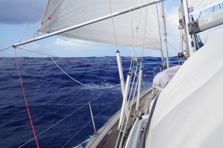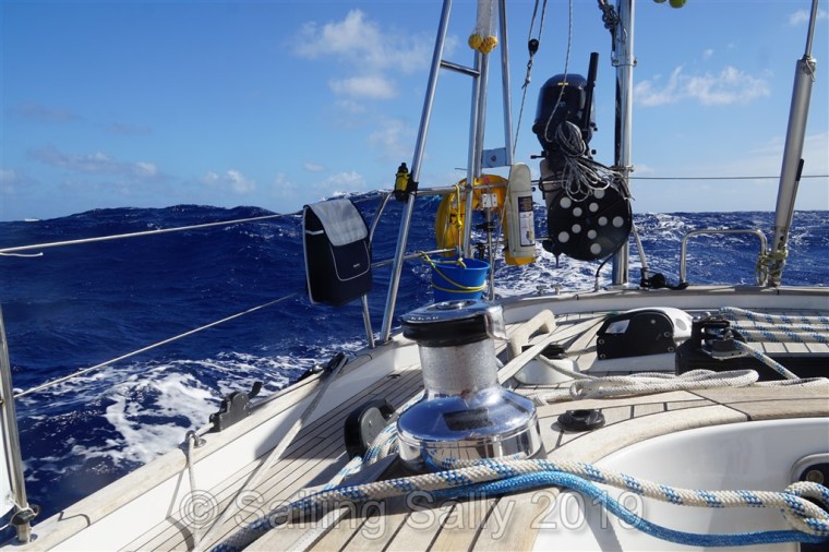 Last night we had some rain and 30-knot gusts from a couple of squalls. We had to gybe and change sails a couple of times and finally, we were so tired that we sailed only with the jib on the inner forestay. It was not the fastest sail, but we could use it with only one person awake. Now we have changed to the genoa, still a bit slow, but no flapping and we can use it in wind up to 25 knots and still handle it with one person. Easy to gybe with, no preventer to take care of, no whisker pole to wrestle down on a rolling foredeck. We shall be able to live like this for almost a week before the wind decreases.