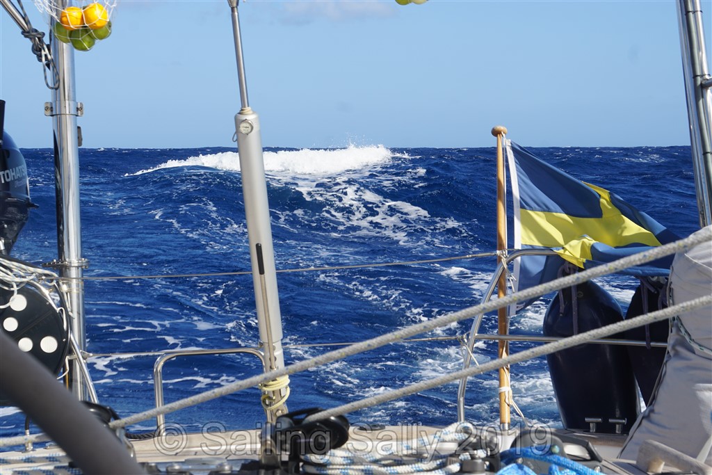 Now Sally has started to move a bit faster over the Atlantic Ocean, think we have had an average speed of 8 knots since yesterday, which means 180 nm closer to destination. The sailing is a bit bumpy and a crossing swell causes severe rolls now and then. We have adopted the new movements during the day and always keep a firm grip on something. This kind of sailing requires more attention to the wind and sea so we don’t break something. We have a couple of light rain showers today, but only for a couple of minutes each time and only with minor wind changes. We are all fine and show no sign of seasickness even in this bumpy ride we have today and it should continue the whole way to Saint Lucia according to the weather prognosis.