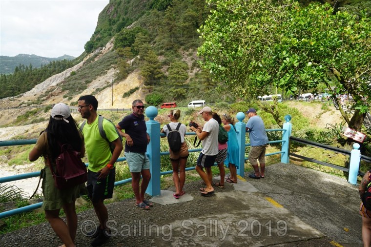 We visit an active volcano where it bubbles up hot sulfur-emitting gases in hot springs.
