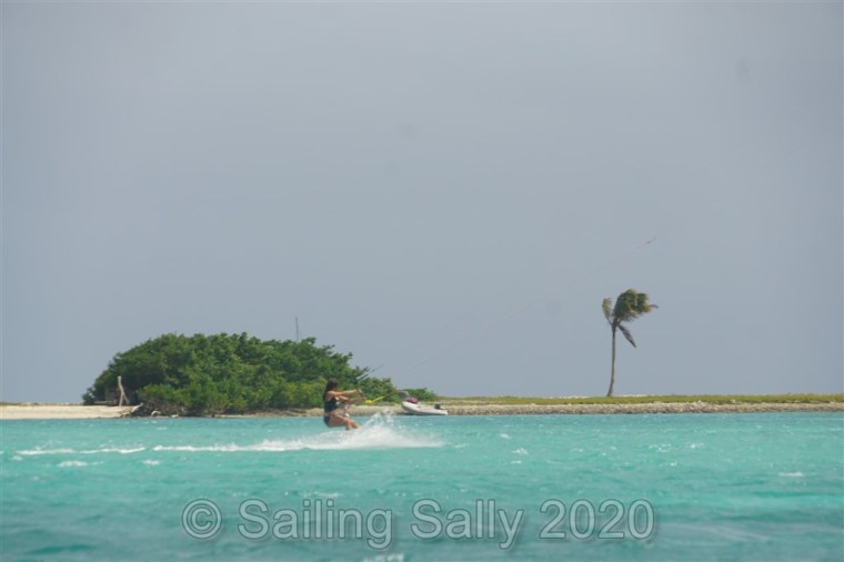 I viken vid Frigate Island kite-surfas det en hel del. Det blåser friskt över en skyddande landtunga mellan Union Island och Frigate Island. Hela tiden vi låg ankrade här hade vi mellan 20 och 40 knops vind. När jag snorklade i viken såg jag långa plogfåror efter draggande ankare. Det är bara ett tunt lager av korallsand som täcker bottnen här. Vårt ankare fäste bra och rörde sig omkring 1 m under de dagar vi låg här. Att ha ett ankare som inte flyttar sig är A och O för god nattsömn.