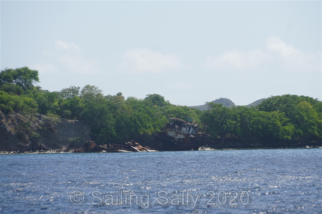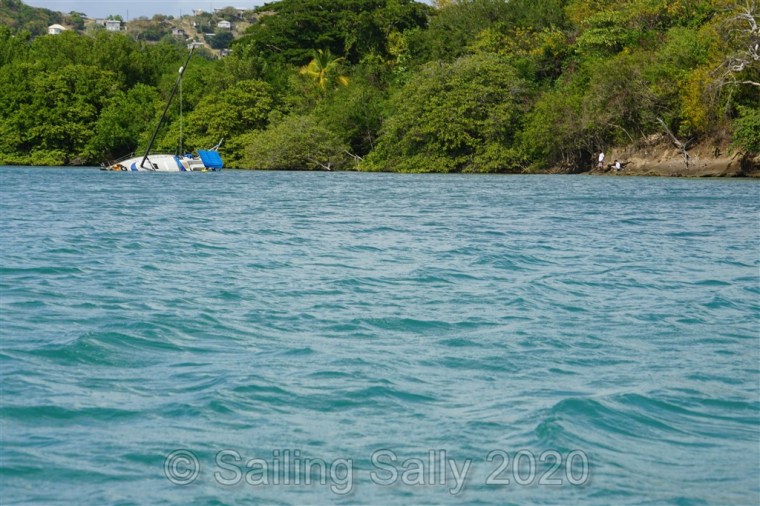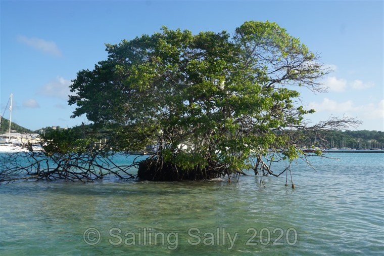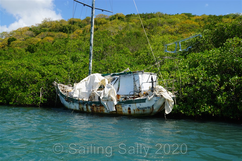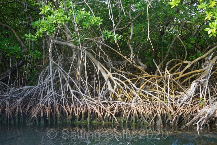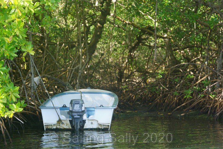 Vi tar även en tur med jollen ut i mangroven som växer i norra änden och här syns spår från båtar som sjunkit i någon orkan som inte bärgats. Man ser även spår (träden saknar grenar med löv) i mangroven efter båtar som varit förtöjda under orkansäsong.