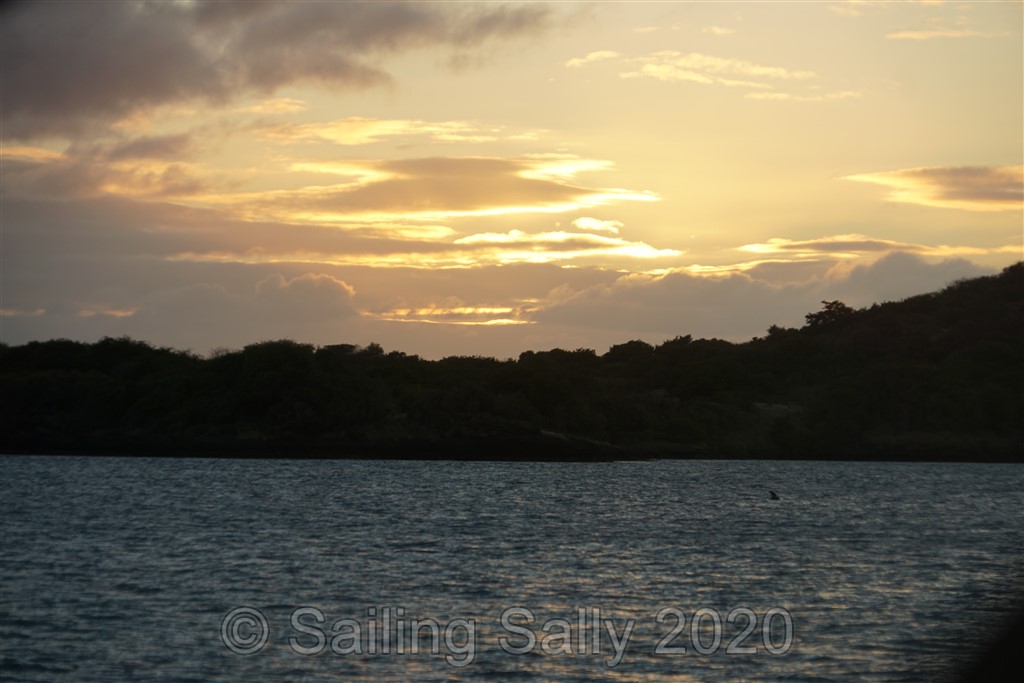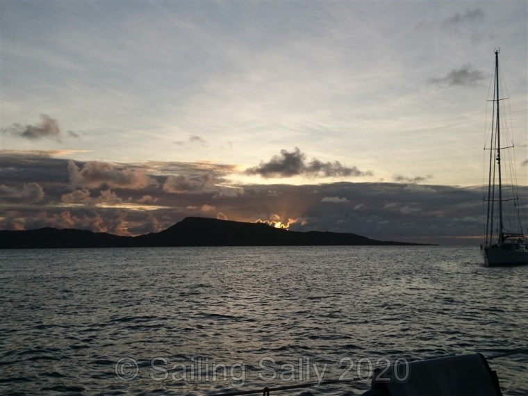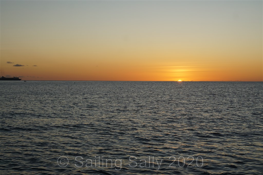 Eftersom vi ligger så nära revet vid Sandy Island, väljer vi att gå upp till Hillsbourough nästa för att köpa lite färska grönsaker som inte fanns i affären i St George. Ankrar nära bryggan och tar jollen in. När jag tar en promenad längs huvudgatan bort mot stranden, får jag en luggsliten gatuhund efter mig. Så fort jag kommit utanför bebyggelsen ändra hunden humör och börjar morra och går med sänkt huvud mot mig. Inga andra människor i sikte, inga tillhyggen att försvara mig med. Provar att visa tänderna, morra och gå snabbt mot hunden. Det fungerar, den vänder om och retirerar några meter, jag gör ytterligare ett utfall och den retirerar ännu mer. Ändå dags att vända åter mot stan och hunden håller sig på behörigt avstånd. Hittar en liten grönsaksaffär med några grönsaker jag känner igen och som vi kan behöva ombord. Johan hämtar upp mig vid bryggan för färden tillbaka. Vi får en fin solnedgång med fantastiska färger när solen försvinner ner bakom horisonten.