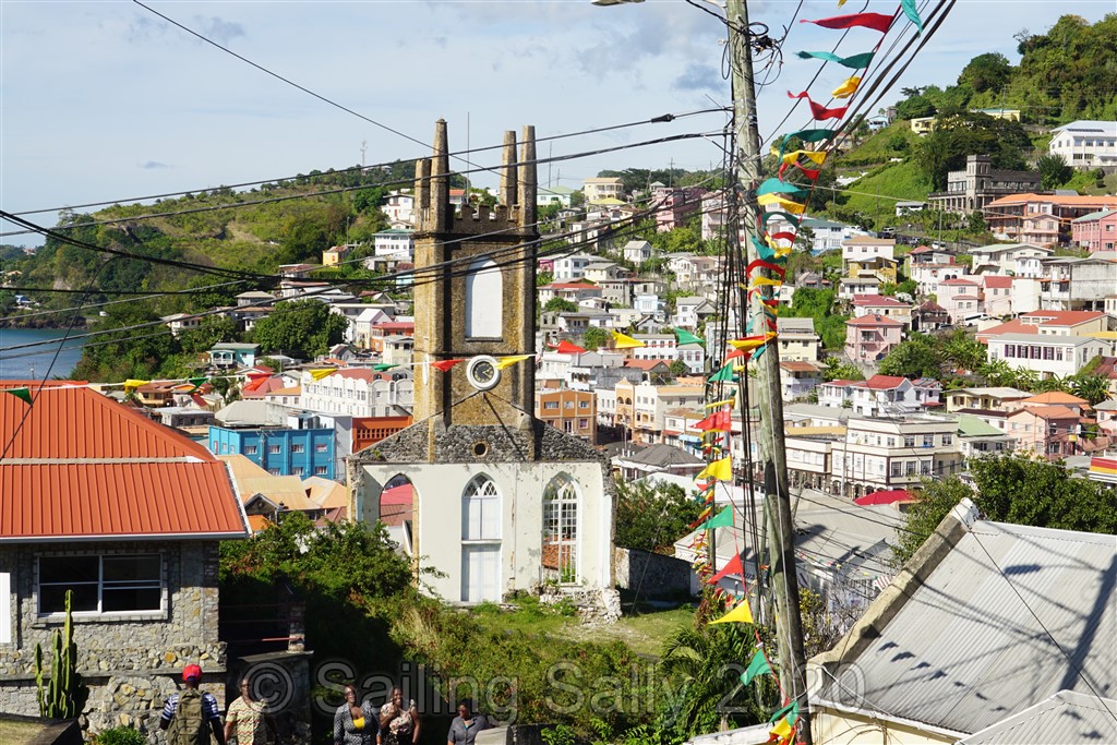 Johan kör in mig till St George och släpper av mig vid det gamla tullhuset. Genast blir jag tilltalad av en man som presenterar sig som Paul och säger sig jobba som guide för turistbyrån. Han undrar om jag behöver guide. Jag tackar nej eftersom jag brukar hitta bra själv. Säger att jag ska upp till fortet och titta på utsikten. Inga problem enligt honom, och han följer gärna med dit upp om det är något jag skulle vilja veta. Eftersom han är trevlig och är välklädd får han följa med. Det är inga problem att hitta upp till fortet och jag går runt en stund och kikar på utsikten med Paul hela tiden i närheten. Han berättar att polisen fortfarande använder fortet, vilket jag redan listat ut eftersom det står skyltar om det. När jag ska vidare föreslår Paul att vi går ner mot kryssningsfartygen, jag säger till honom att han inte behöver guida mig längre, det är inget problem säger han. Han berättar att nästan alla hus i stan blev utan tak i orkanen Ivan 2004, det är därför det är nya tak på alla hus.