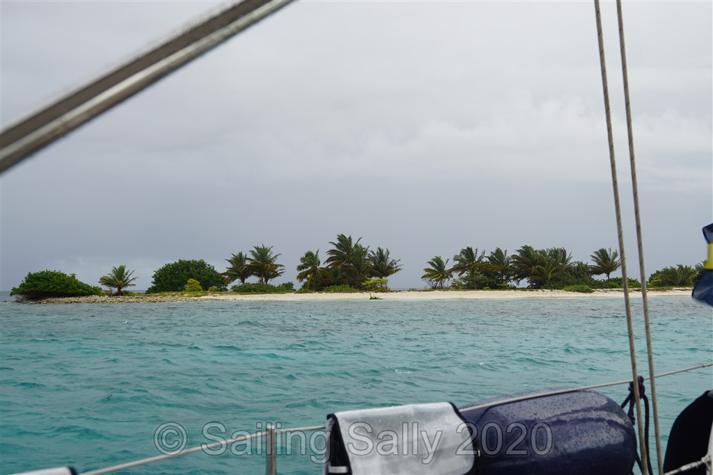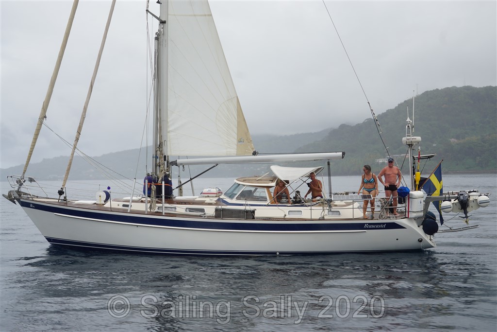 Nästa dag blir det motorgång och segling upp till Sandy Island vid Hillsbourogh på Cariacou. På vägen möter vi Beaucastel från Västerås och vi stannar och pratar lite. De är på väg ner till St George på Grenada för att släppa av vänner som har seglat med dem ett tag. Vid Sandy Island ankrar vi nära revet. Det ligger två andra svenska segelbåtar här, Amaran och HR45 Mayfair. Under natten vrider vinden och vi kommer väldigt nära revet med aktern på båten.