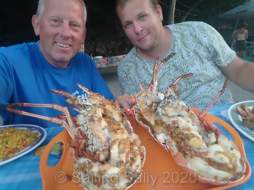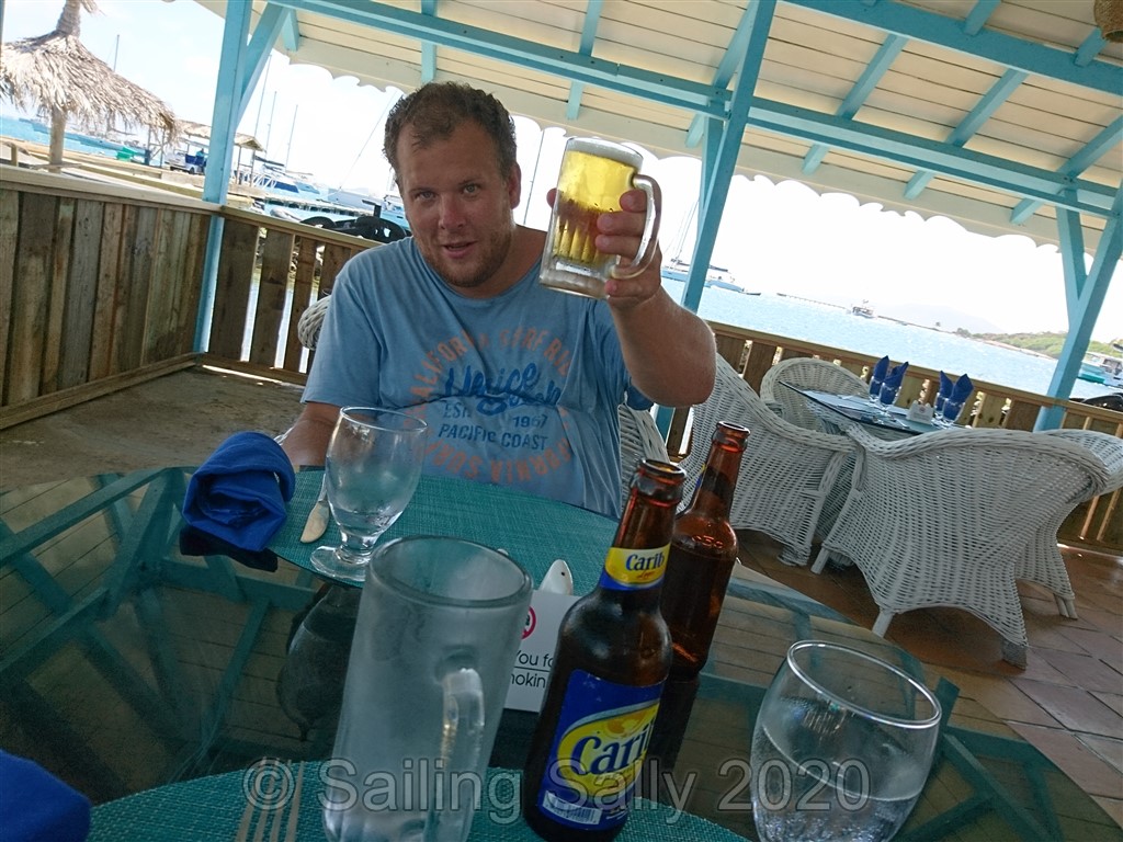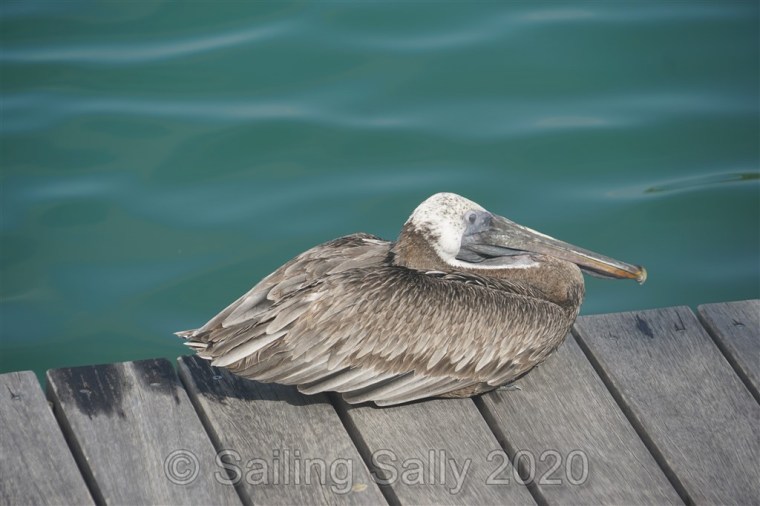 We got a berth at the far end of the jetty. There was a large bridge post on one side which made it difficult to get ashore because we couldn’t get close with the stern. While we wait for them to arrive, we prepare the boat so that they can stay in the forward cabins where they arrive and Johan moves into the aft cabin. We also got time to eat a late lunch at the restaurant where a magnificent pelican has its own place on the dock outside.