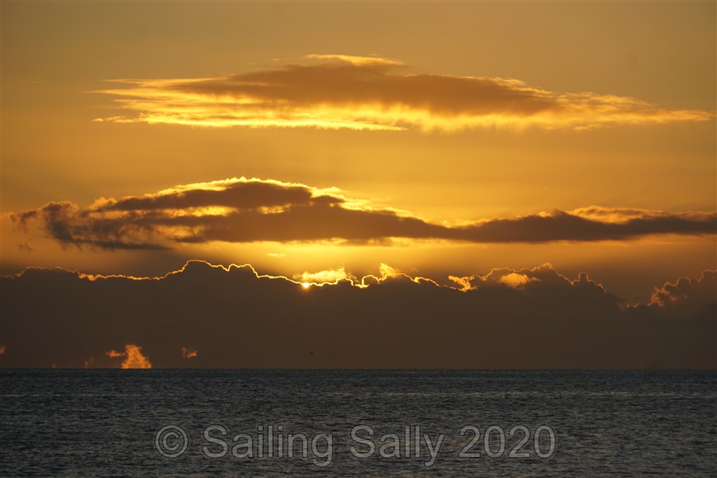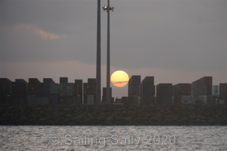 At first we anchored inside the headland east of the marina, but there you are not allowed to anchor as it is a nature reserve which is not shown in our chart (latest version). We are assigned a buoy outside the marina and there we can see the sun go down between the containers in the harbor.