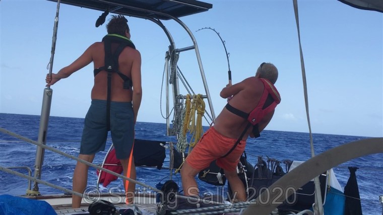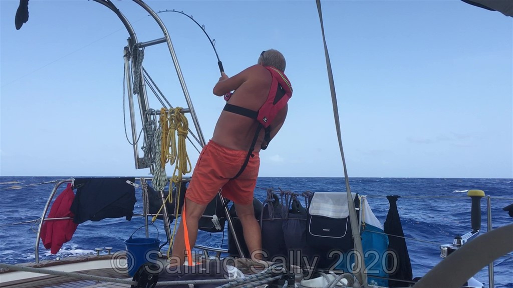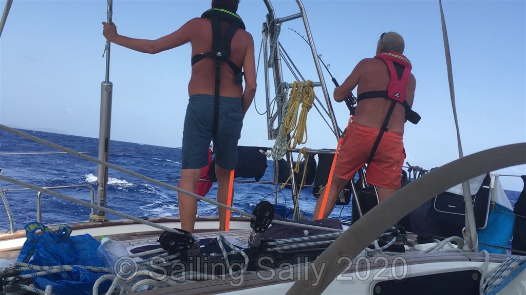 Så fort vi kommit ut på djupt vatten, över 100 m djupt, är det dags att börja fiska. Idag seglar vi längs med stråken av sargasso-tång som bildas kring alla öar. Tången kommer från Atlanten och driver med vind och ström mot Windward Islands som den här delen av Karabien kallas. Den tång som inte fastnar på en ö, driver längs med öns framsida mot sunden mellan öarna. Där bildar den långa stråk som driver in mellan öarna och i dessa stråk av tång gillar Mahi-Mahi att jaga ute på djupt vatten. Så om det finns sargasso och flygfisk, då finns det förmodligen även Mahi-Mahi. Idag var det mycket sargasso och mycket flygfisk. Johan har även fixat nya fiskedrag, så nu borde det bli napp!