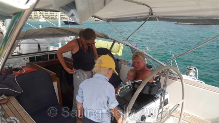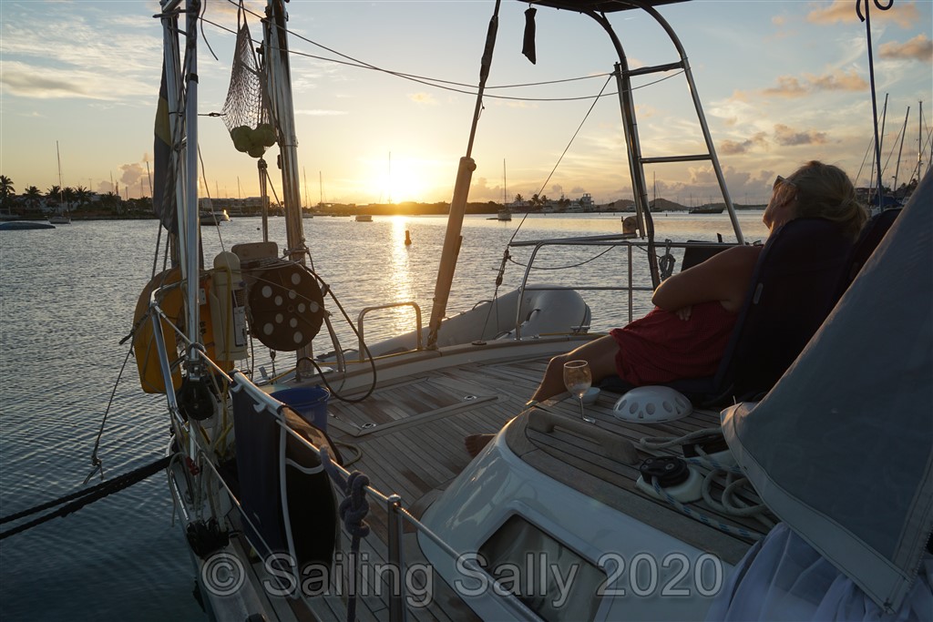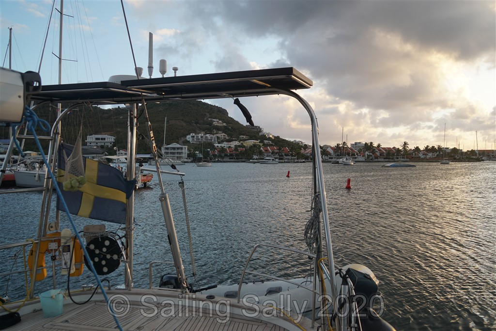 Vår vakna tid i karantän på Sint-Maarten tillbringar vi i sittbrunnen eller i vattnet. Vi får lämna båten och ta jollen till Police dock för att slänga skräp. Eftersom dyningen går in i Simpsons Bay och träffar båten från sidan, rullar den väldigt mycket hela tiden, dag som natt. I såna här lägen skulla jag vilja konvertera båten till en katamaran, som inte rullar på det här sättet.