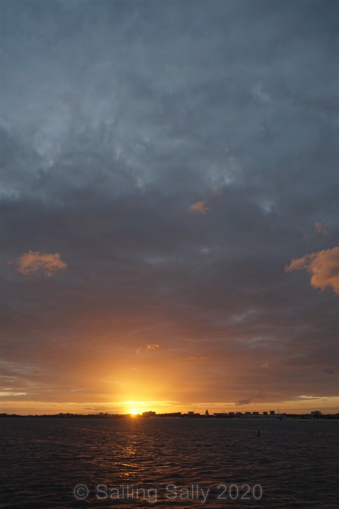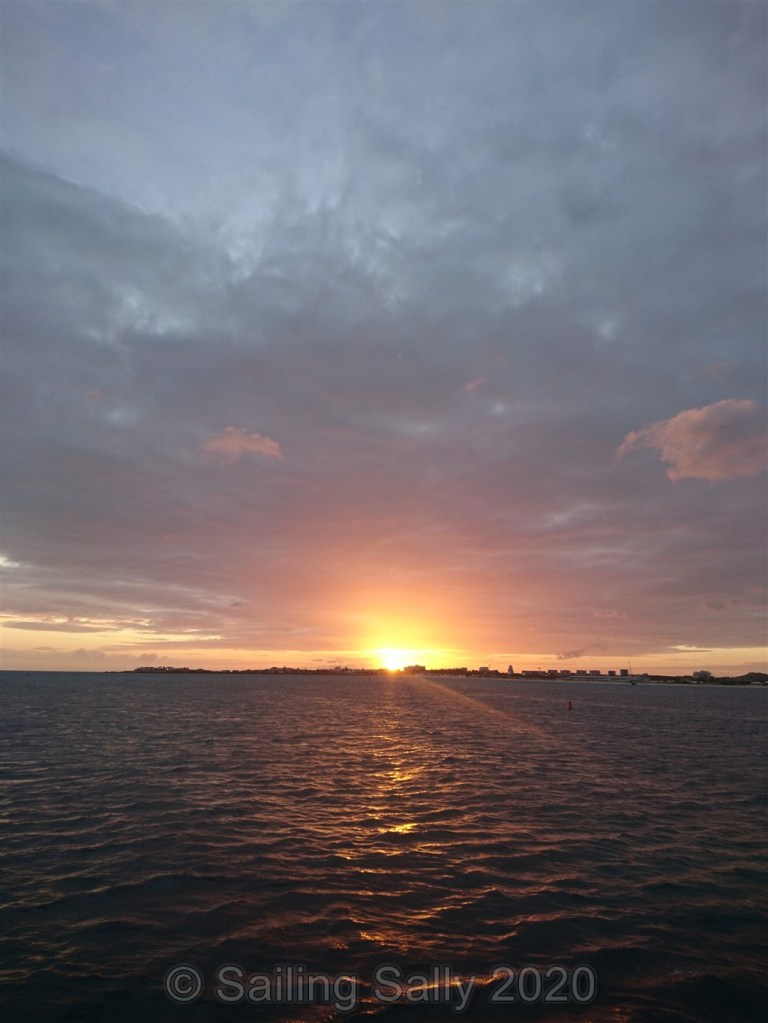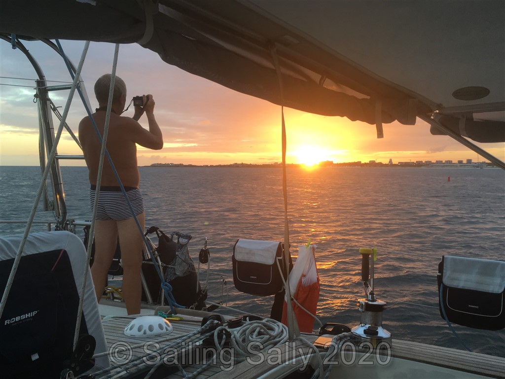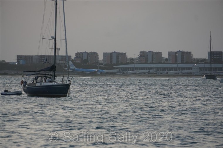 Första kvällen i Simpsons Bay njuter vi en av många fina solnedgångar här. Den här är speciell, eftersom flygplanet som Sofia, Johan, Sixten och Klara ska åka med, ska starta srax efter att solen gått ner. Vi sitter i sittbrunnen och väntar på att flyget ska starta, vi får vänta till framåt åtta på kvällen innan planet kommer iväg.