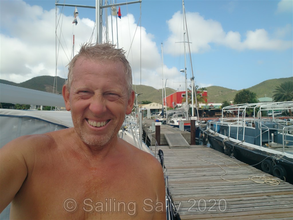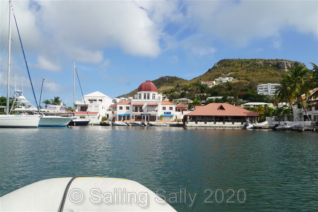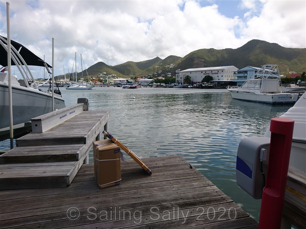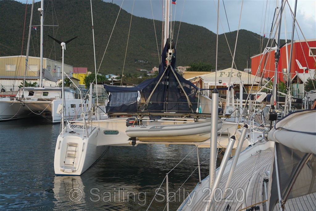 Inne i lagunen möter FKG upp med en båt som ska visa oss vägen fram till deras brygga. Vårt sjökort stämmer inte alls med hur farleden är markerad i verkligheten. Hade vi inte haft guide, hade vi fått leta oss fram med hjälp av plottern och ekolodet. Det är stora grundområden på båda sidor om leden som svänger flera gånger. Vid FKG’s brygga ligger några båtar som varit fast här sen Sint-Maarten införde utegångsförbud för nästan 2 månader sen. Kan inte ha varit så roligt, ingen svalkande vind och ingen möjlighet till bad. Det är ett par från Tyskland och ett från Spanien. Båda båtarna ska få sina reparationer klara den vecka vi är hos FKG. Det tyska paret ska till Panama och det spanska paret ska till Puerto Rico med sin katamaran 4 Patas under orkansäsongen.