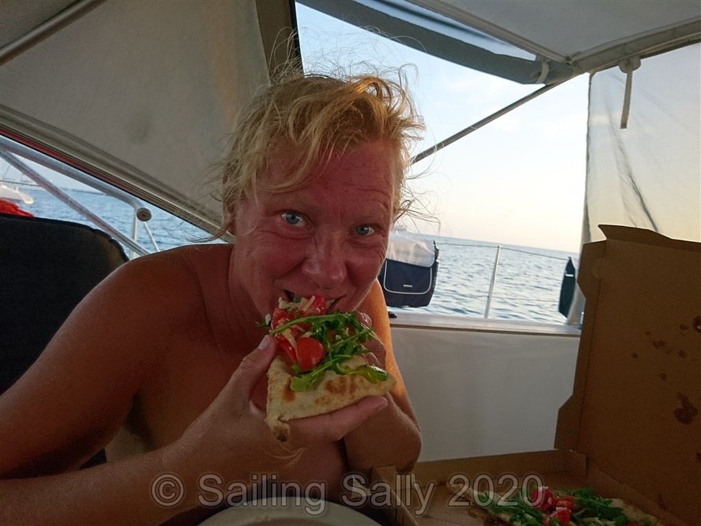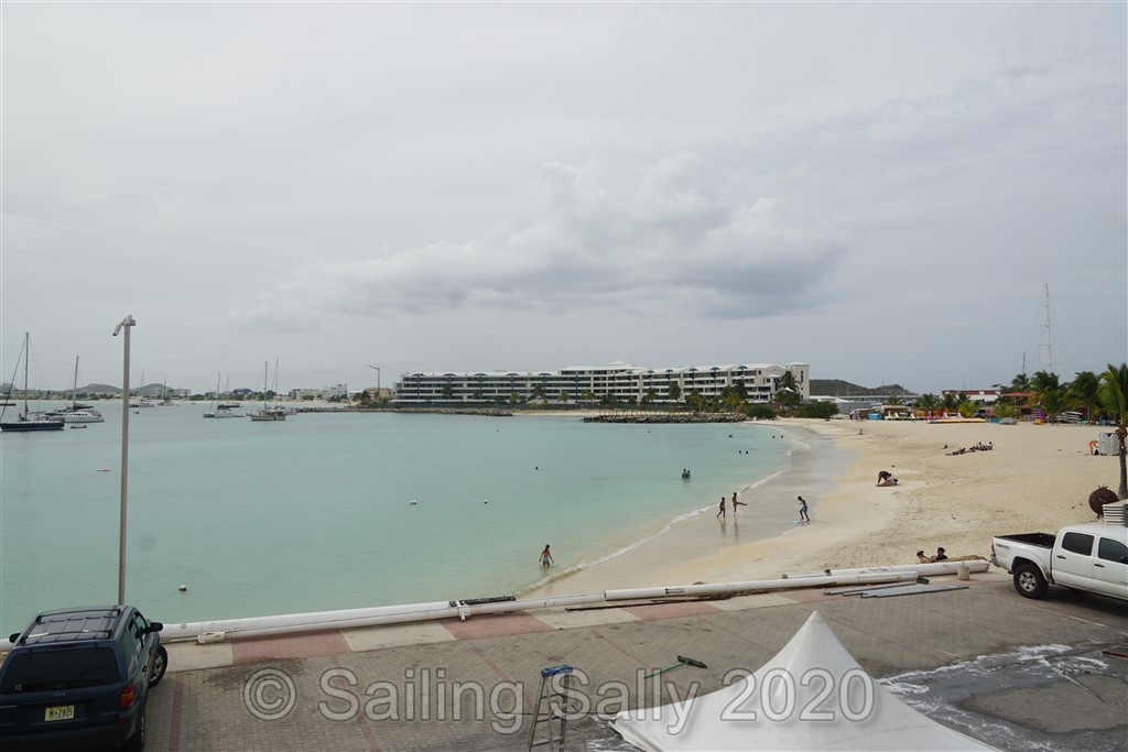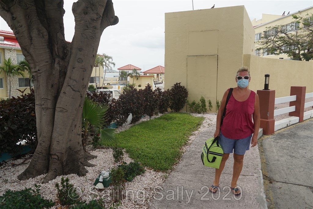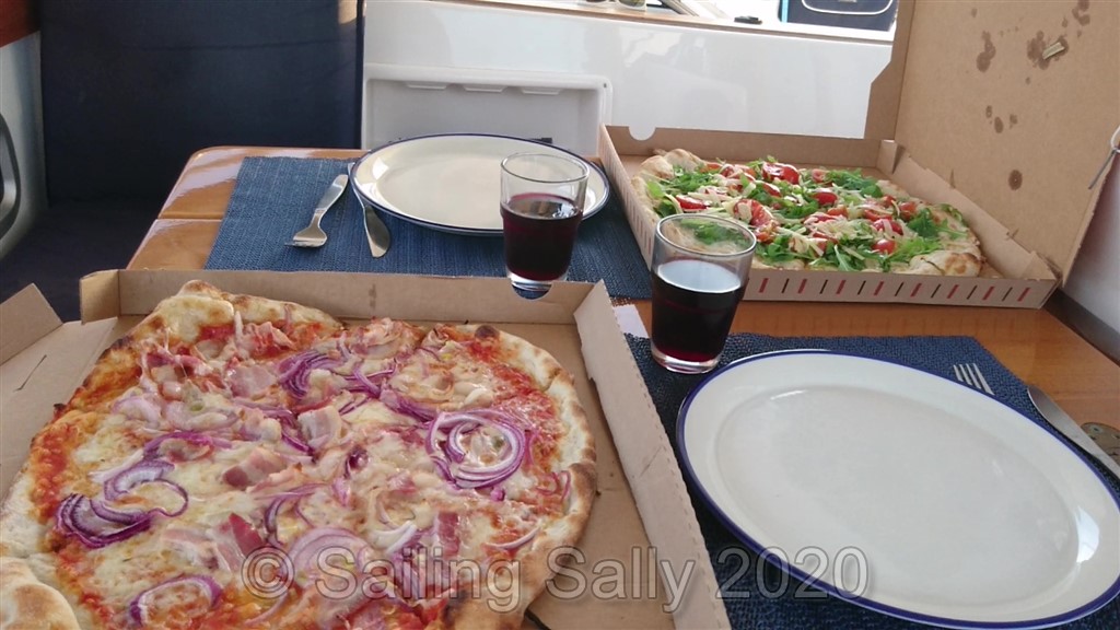 Efter 2 veckor i karantän är vi äntligen fria att gå iland om vi följer de regler som finns, minst 2 m avstånd till andra, andningsskydd bland folk ute och inne, utegångsförbud efter nio på kvällen. Vi kan äntligen handla mat, tyvärr är inga restauranger öppna. Det finns en öppen pizzeria, Pizza Italy, med take away nära där vi går iland med jollen (vid Simpson Bay Yacht Club nedanför apoteket). De har supergoda pizzor Napoli style, mm.. så gott det var efter 2 veckor konserverad mat.