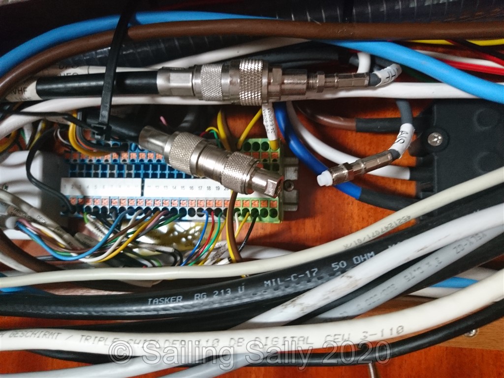 Jag går igenom kabelskarvar på antenn-kabeln och hittar problemet i skarven till masten. Det är en skarv som gått isär och det är bara att skruva ihop den igen. Jag ser också att skarven till VHF-antennen är dåligt ihopskruvad.