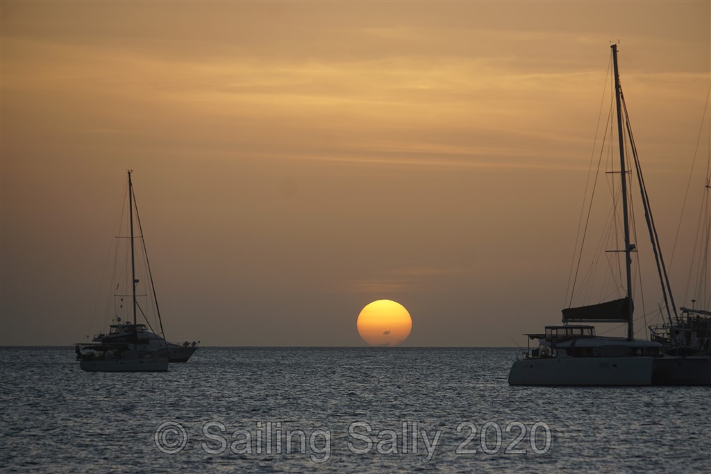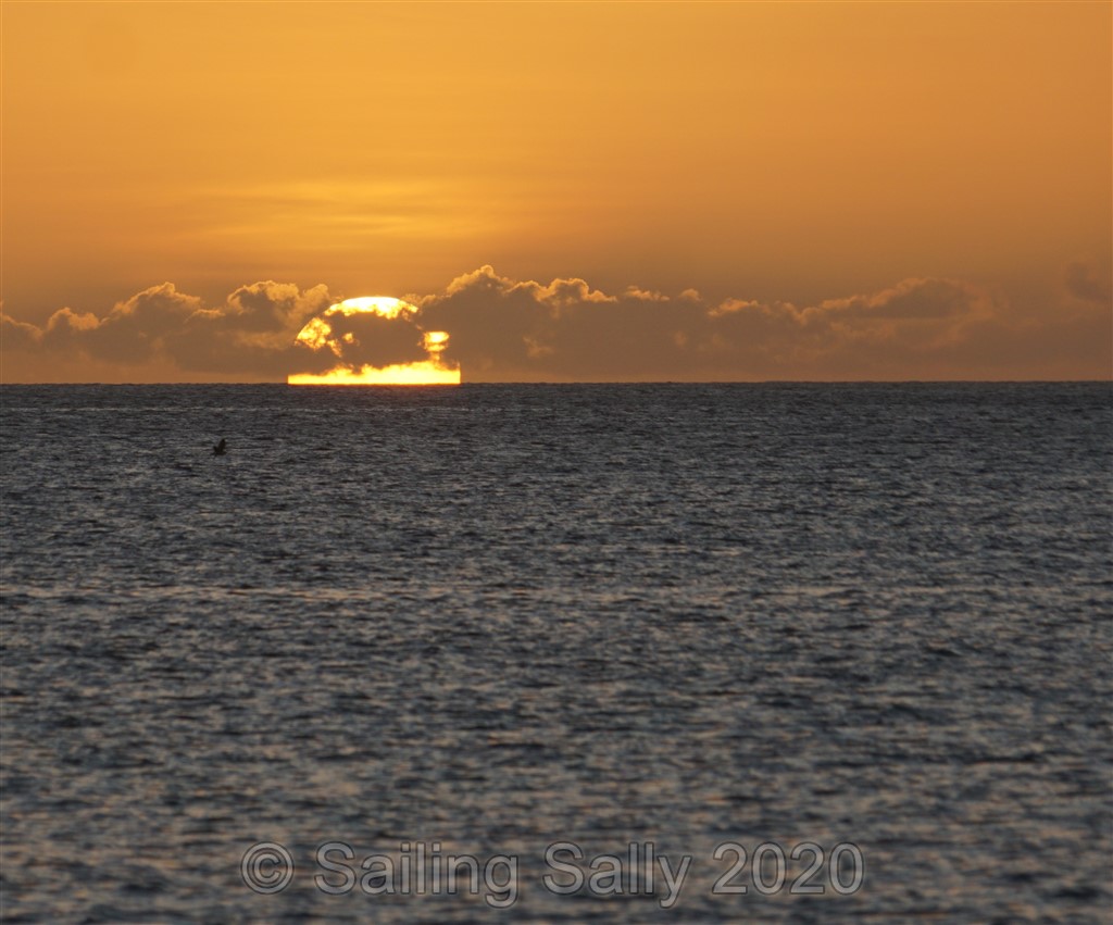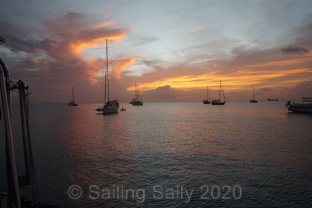 När vi seglar i sundet mellan St Lucia och St Vincent (St Vincent Passage), börjar det mörkna och vi ser solen gå ner bland mörka moln. Det ser ut att bli en mörk natt på havet med regnskurar och eventuellt åska. Som tur är ser vi bara blixtar lysa upp molnen långt bort. När solen böjrar gå upp seglar vi förbi undervattensvulkanen Kick’em Jenny strax norr om Grenada. Eftersom den är aktiv nu passerar vi utanför den yttre säkerhetsgränsen för att slippa överraksningar i form av uppstigande gasbubblor som kan sänka en liten båt som vår.