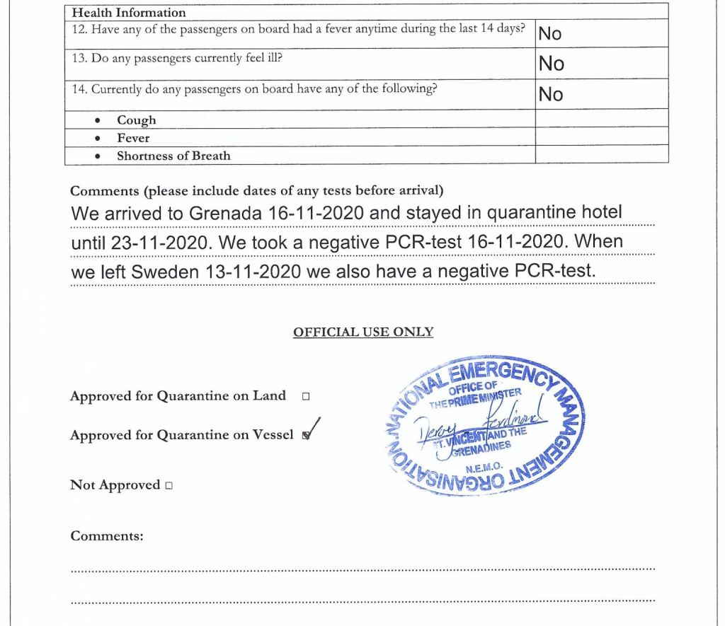 - Dokumentet Request quarantine onboard.pdf laddas ned från http://health.gov.vc/health/images/PDF/stories/YACHTS_Request_for_Quarantine_Onboard_nov.pdf. Jag fyllde i dokumentet på min dator och sen kunde jag bifoga filen i mejlet till svgarrivals@gmai.com.