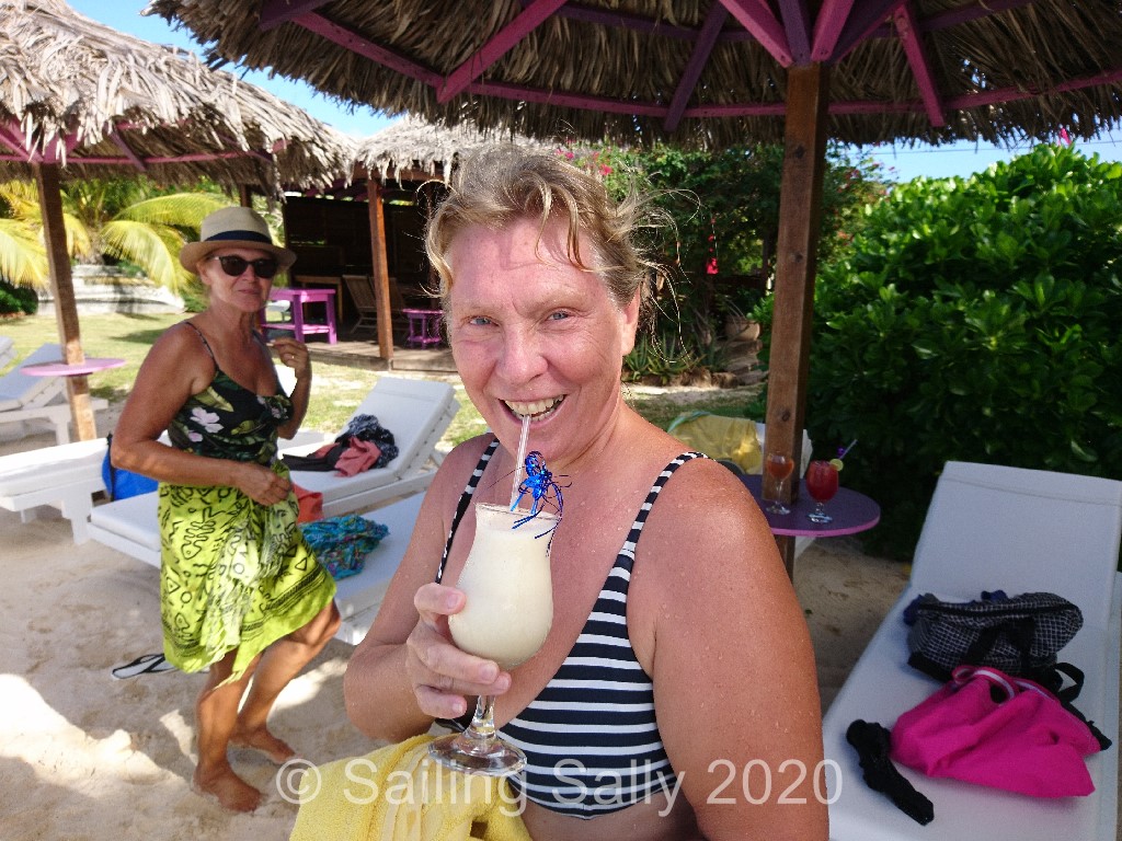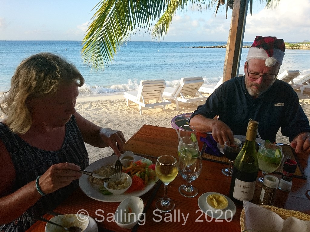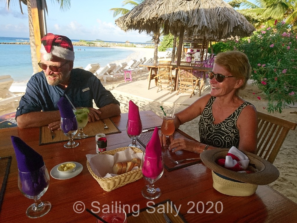 On Christmas Eve, they come by car from Sparrows Beach Club and pick us up at the pier in Ashton. Sparrows Beach Club is located on the north side of the island, at a fine sandy beach with a protective reef outside. The driver have a lot of other business to take care of and after 30 minutes or so we arrived at the beach club. Now we got some nice hours at the beach before we should have dinner. There was a lot of time for swimming, snorkeling on the reef, and having a drink before it’s time for Christmas dinner on the beach.