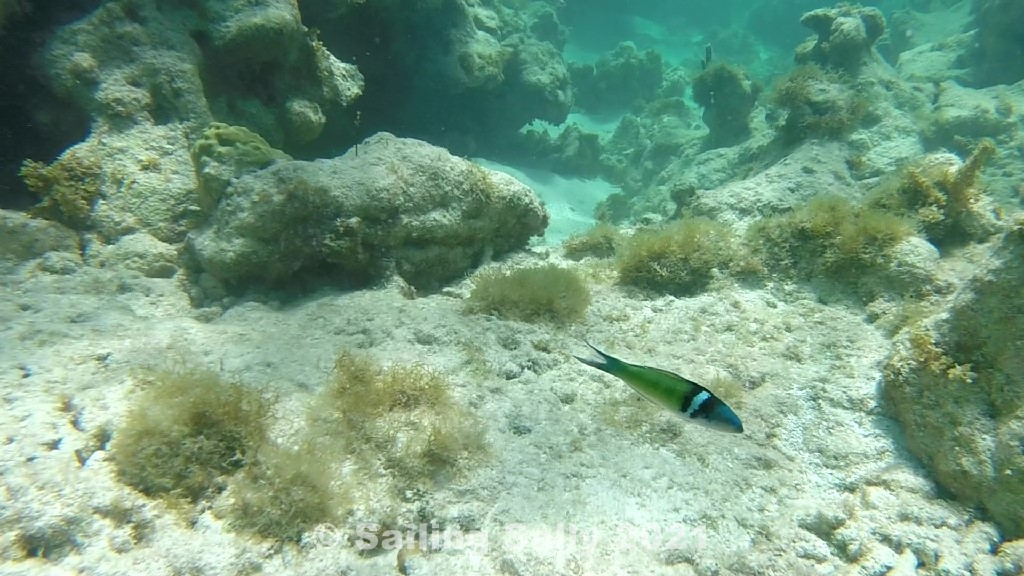 Vid förra besöket här vågade vi inte snorkla eftersom vi hade hört att besättningen på en båt hade siktat en grupp tigerhajar vid sin båt som låg ankrad här vid Cocoa Point. Förvisso låg båten några 100 meter längre ut än vi, men ändå, tigerhajar har vi stor respekt för och befinner oss gärna inte i vattnet om de är nära.