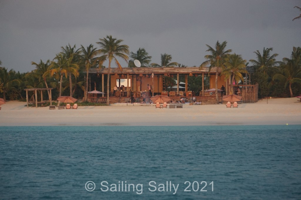 The resort at Cocoa Point has few guests and we see how they also enjoy the sunset from the restaurant on the beach.
