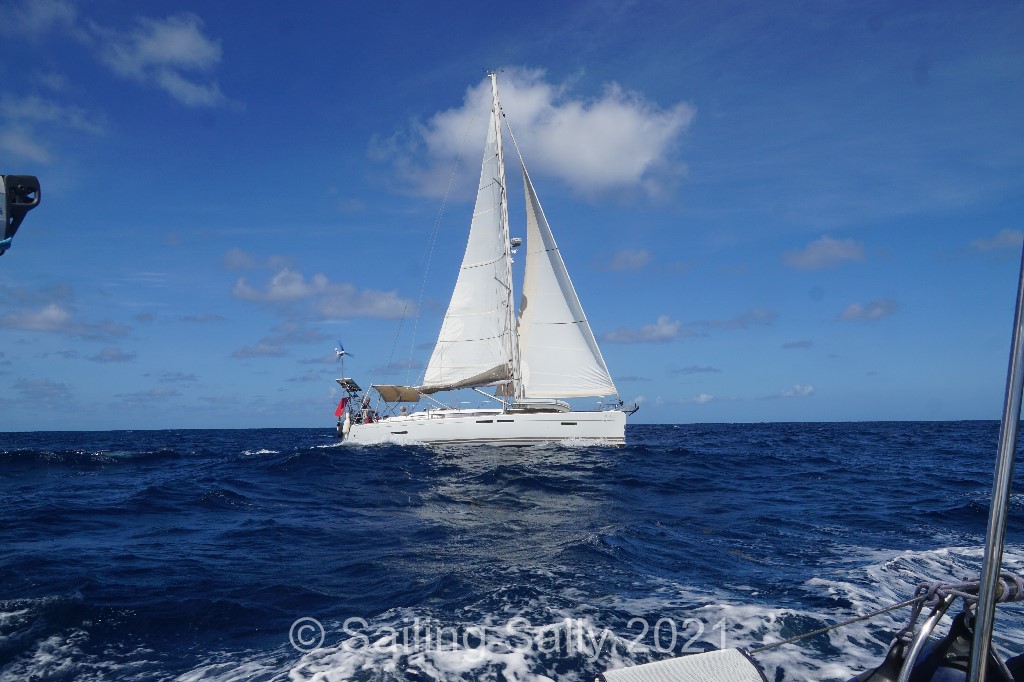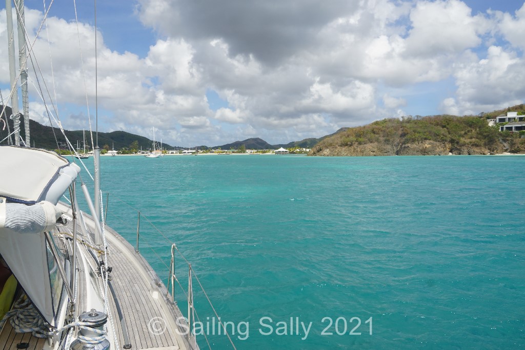 Till sist är tiden inne att återvända till Antigua och Falmouth Bay. Vi får fin segling och möter den tyska segelbåten Orinoco som vi sett tidigare under vår vistelse här i Karibien. Vi passar på att stanna vid Jolly Harbour och handla lite mat.