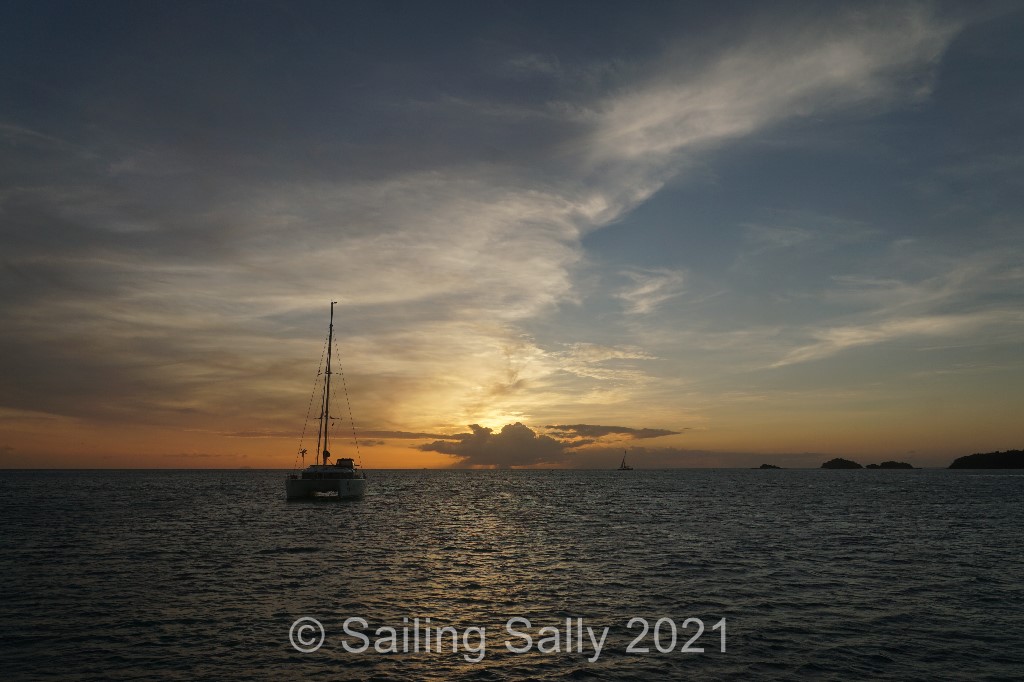 Vi ankrar innanför revet så långt in mot stranden det är tillåtet och så nära revet vi vågar för att ha fri sikt mot söder och sydväst. Moderna katamaraner är stora med höga skrov och överbyggnader. De tar bort rätt mycket fin utsikt. På vissa ställen vi varit har vi knappt sett stranden för alla katamaraner som ankrat mellan oss och land. Samma sak om det ligger några katamarner i lä om oss, då skymmer de ofta utsikten mot solnedgången.