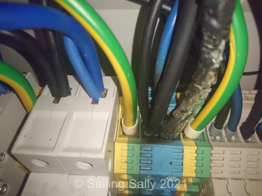 - En överhettad kabelskarv i ett elskåp i motorrummet, den brända kabeln har transporterat hela effekten från elverket och då funkar inte en sån här koppling med flera kablar i samma plint. Monteringsfel som Hallberg-Rassy tar ansvar för och de ska skicka nya delar till oss.