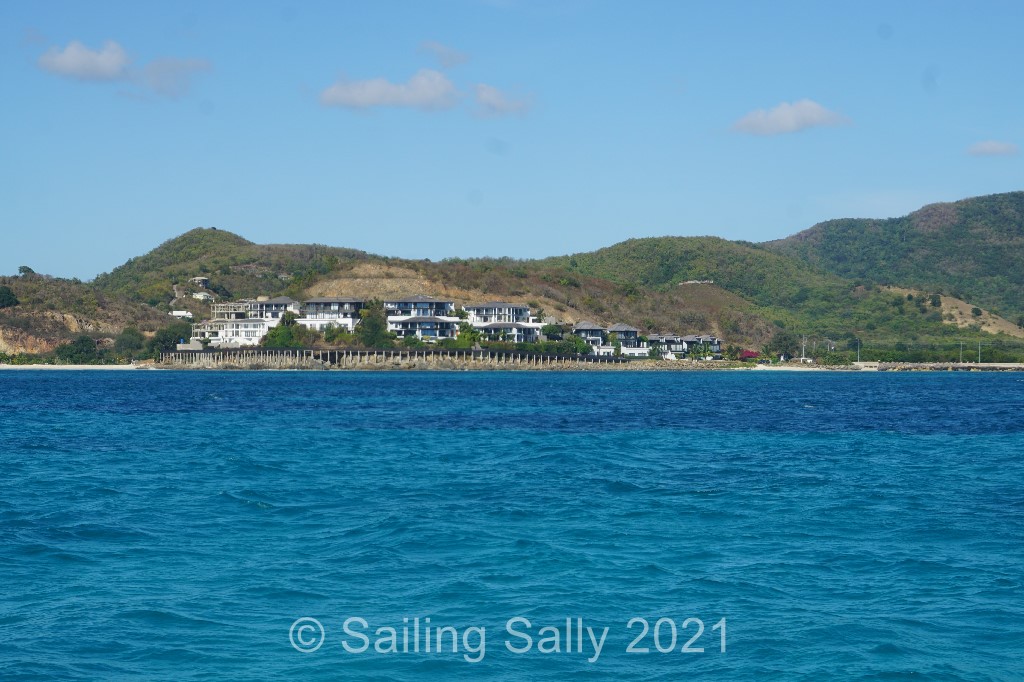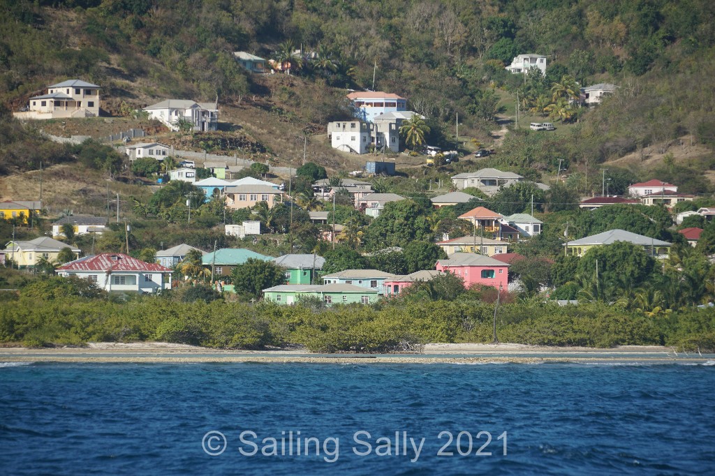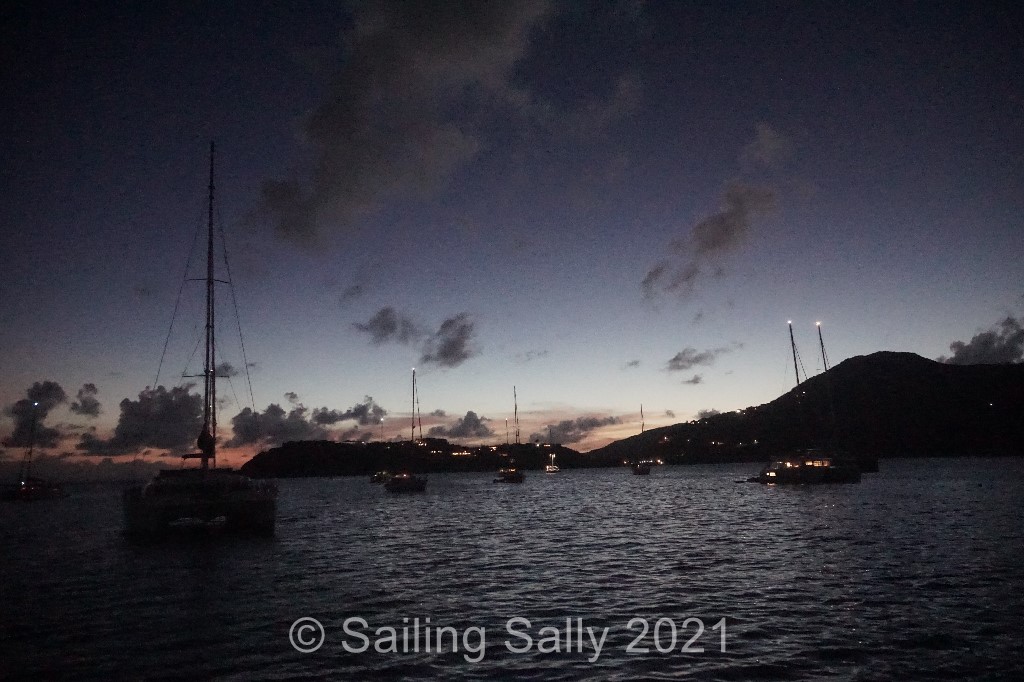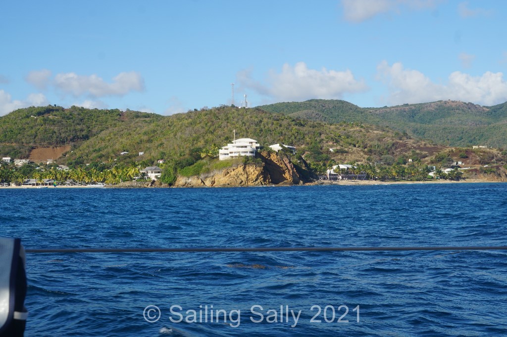 När vi kommer runt den sydvästra udden, måste vi segla rakt emot den ostliga vinden, så vi rullar in våra delaminerade segel och går för motor resten av sträckan ut till Falmouth Bay. Det är många båtar ankrade utanför Pigeon Beach och för att slippa dynigen letar vi ankarplats längst in mot stranden vid den klippiga udden med vita huset.