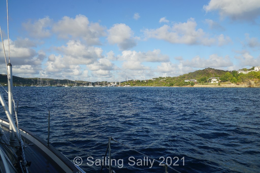 Vi får en fin segling över grunda vatten längs Antiguas västkust söderut från Jolly Harbour. Vi seglar i ett turkosblått hav över ljus sandbotten med 3 m vatten under kölen. Det är hur härligt som helst, men det gäller att hålla koll på var vi är så vi inte seglar på grund.