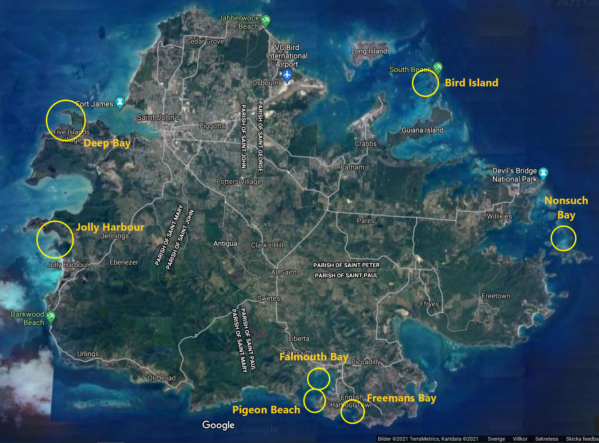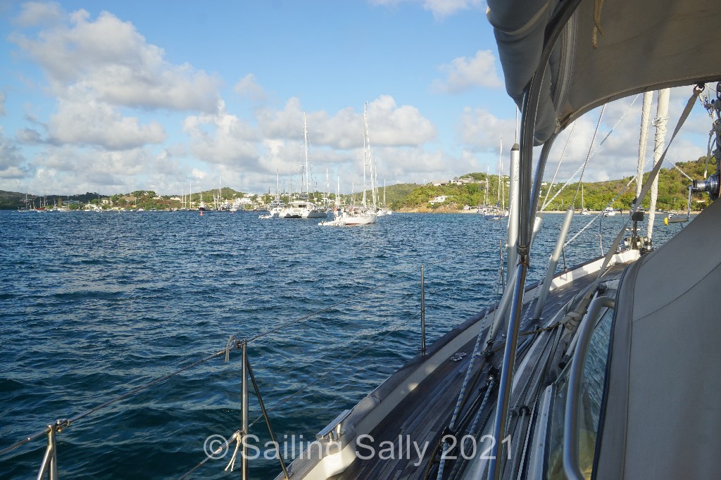 Efter ett kort stopp i Jolly Harbour för att handla, fortsätter vi till Falmouth Bay där vi ska vänta på våra nya segel och några andra reservdelar som snart ska levereras dit. Det kommer att bli en längre väntan än planerat eftersom leveransen blir försenad drygt en vecka. Vi är förvisso vana att vänta på saker men tiden går och vår avfärd mot Europa kommer närmare och närmare och innan dess behöver vi våra nya segel.