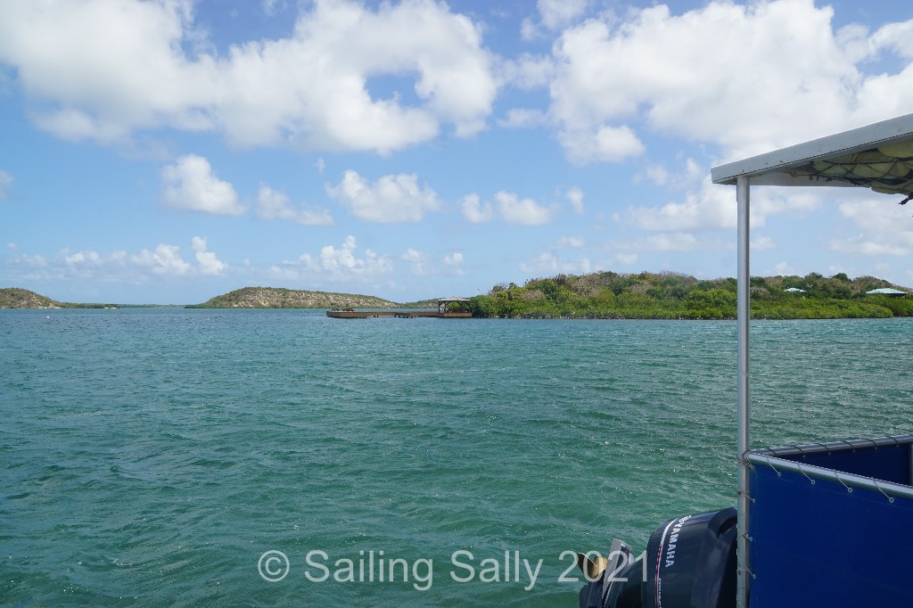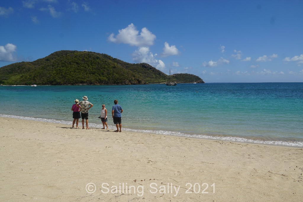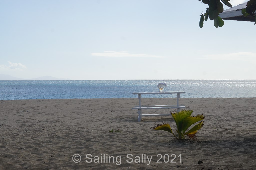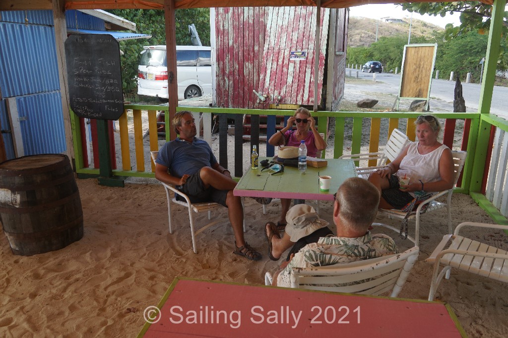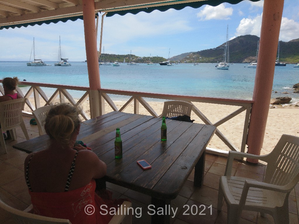 At Pigeon Beach restaurant, Sally is anchored on the right side close to beach