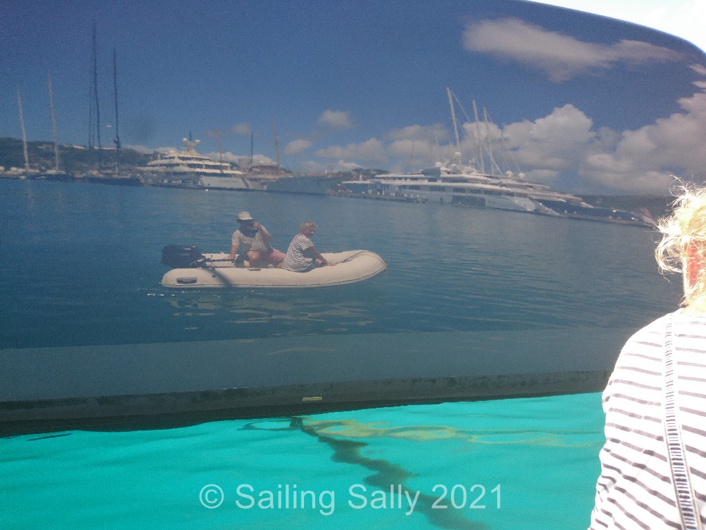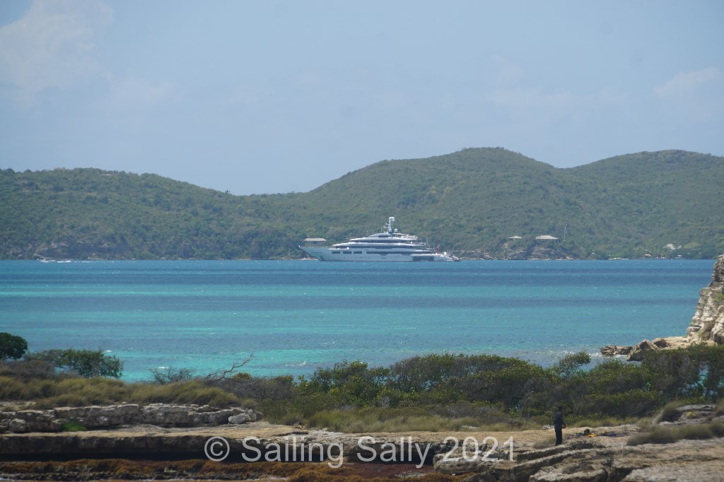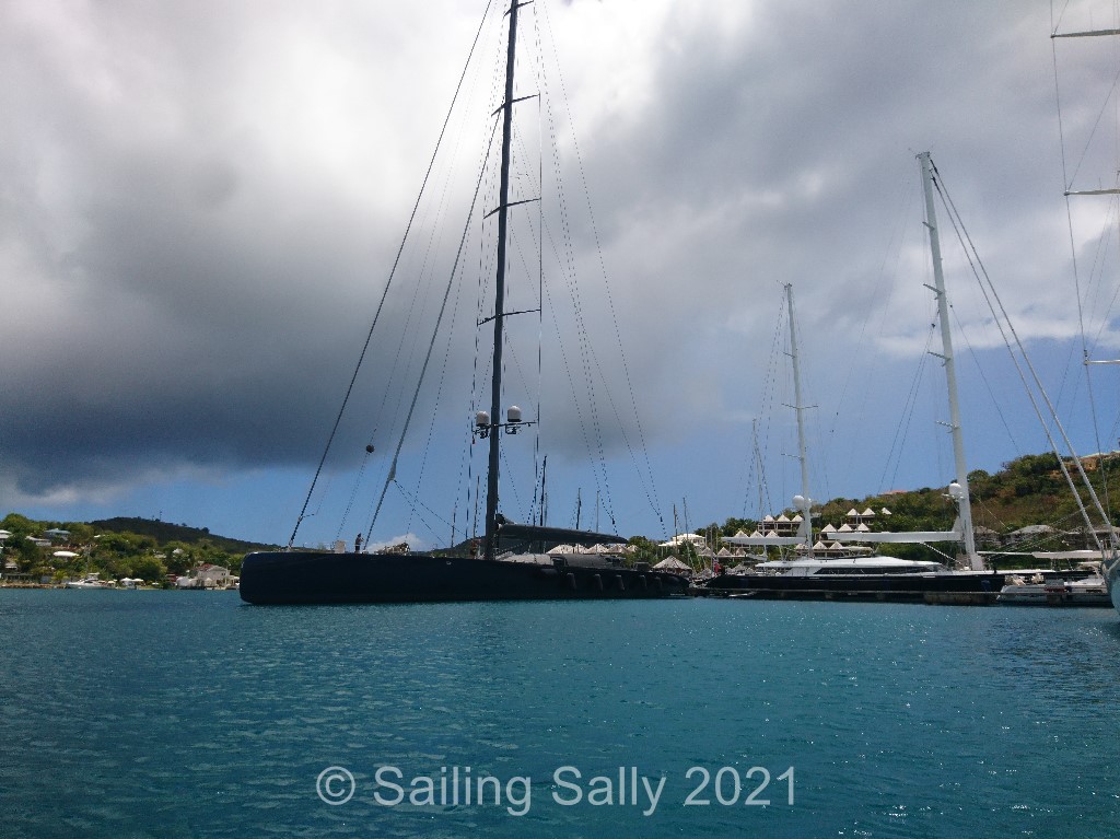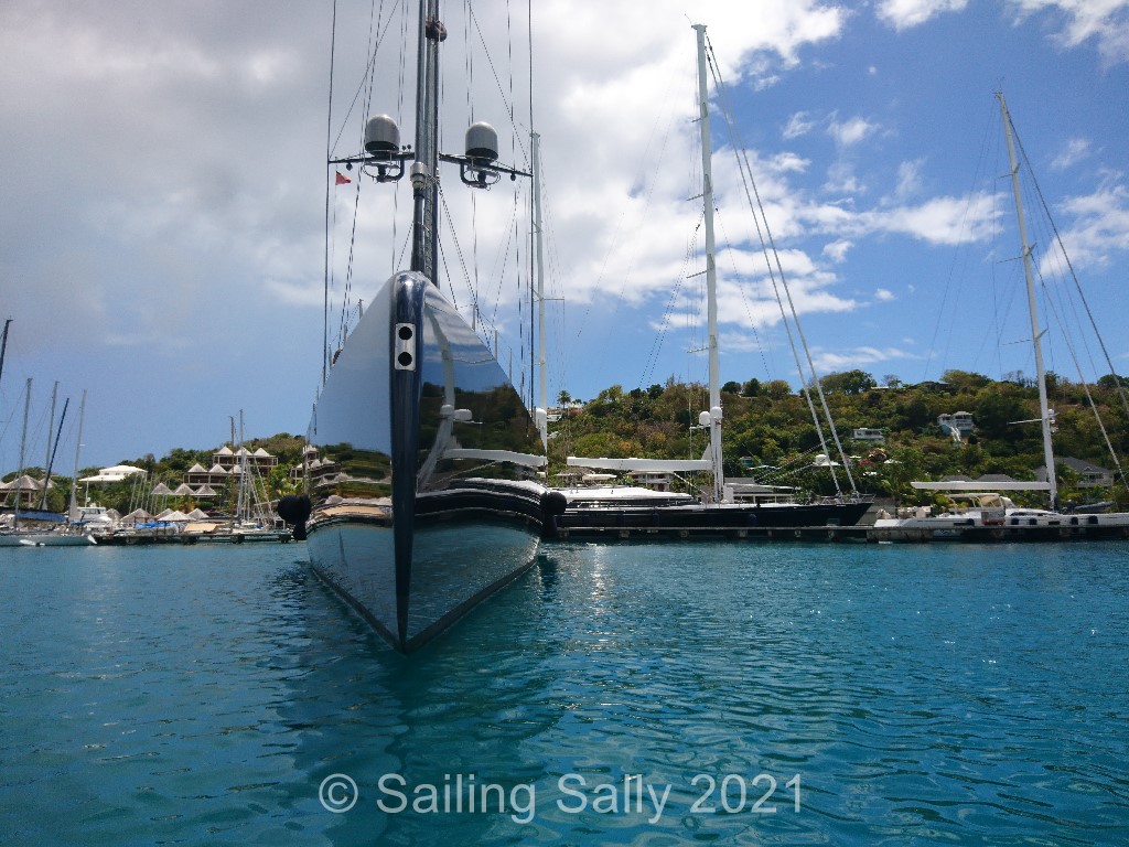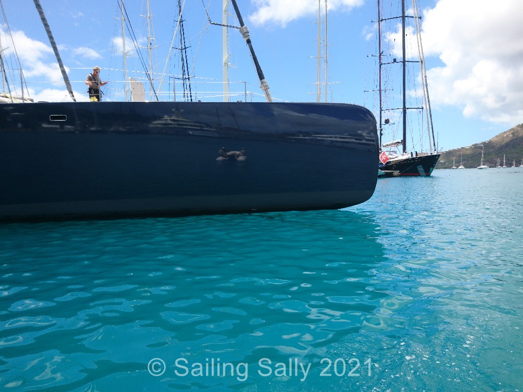 Det är fortfarande många stora lyxbåtar i marinorna i Falmouth Bay. Tillsammans med de borta i Nelsons Dockyard är det kring 20 stora motor- och segel-båtar förtöjda. Pandemin har gjort att de inte kan hyras ut och de ligger mest oanvända vid bryggorna. Alla har dock en besättning som sköter om båtarna och håller de i topp-skick. Kolla in skrovet på Ngoni, det är spegelblankt. Vilket jobb att polera hela det skrovet!