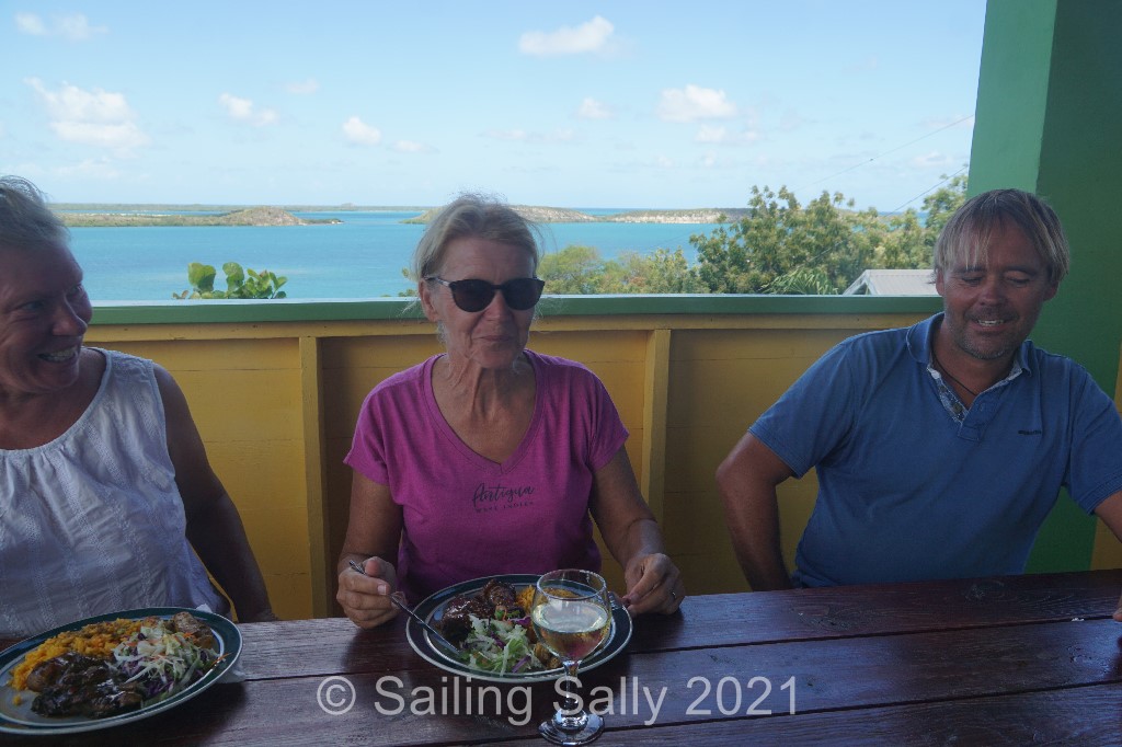 Eftersom vägarna är rätt dåliga så tar det längre tid än man kan tro att köra bil på Antigua. När vi är klara att lämna Stingray City, har klockan redan hunnit bli tretton och alla är sugna på lunch. Vi stannar vid första bästa restaurang som ser öppen ut. Det blir Seaview Restaurant strax efter att vi lämnat Stingray City. Vi är enda gästerna och kan välja bästa bordet enligt oss, det med utsikt över öarna och vattnet kring Stingray City. Utsikten är mangifik och maten är god och alla blir ordentligt mätta.