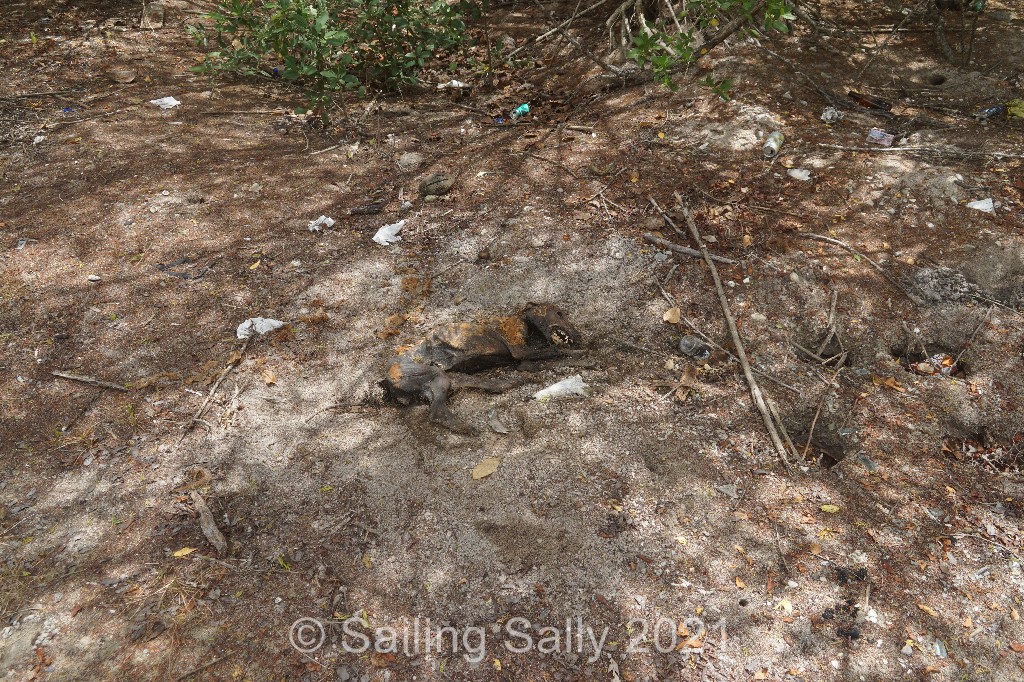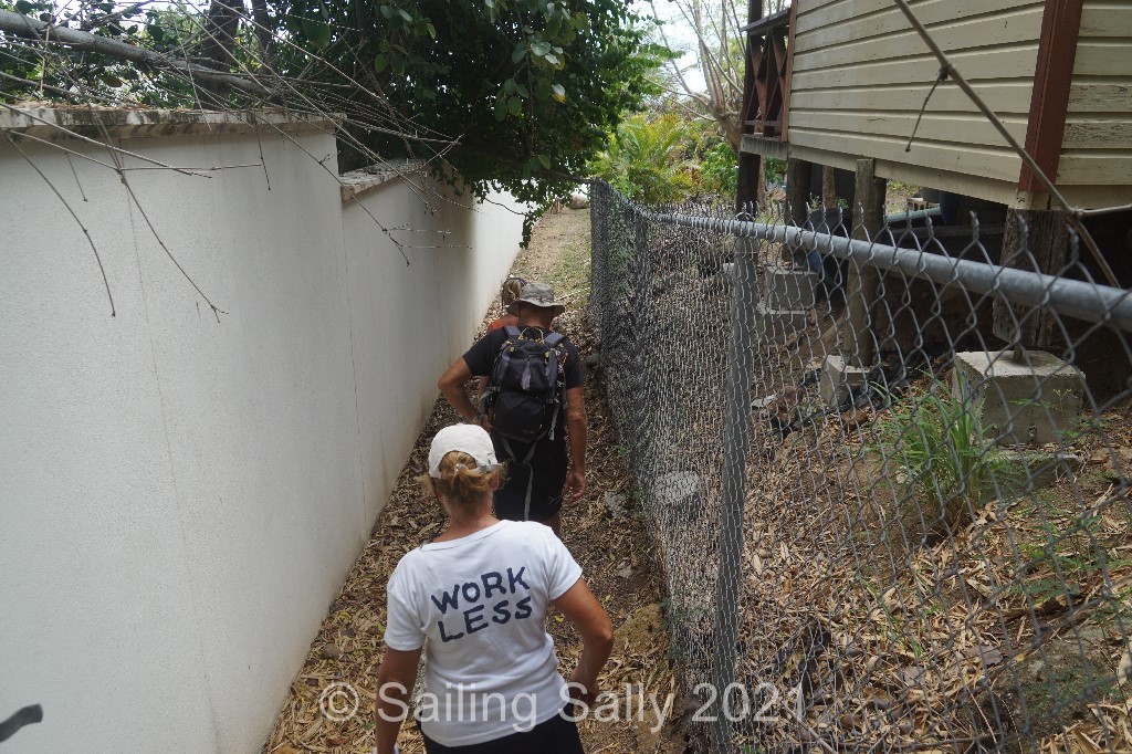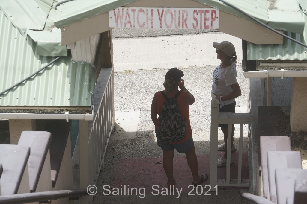 Vi hade hört av Peter på Amaran att det fanns en lång och dold trappa uthugen i berget från ett av husen ovanför stranden vid Turtle Bay Beach som ligger väster om Falmouth Bay. Den ville vi försöka hitta, vi får med oss Håkan och Mirja, de behövde också röra på benen. Vi tar jollarna in till Catamaran Club och därifrån följer vi stora vägen västerut. Ingen tittar på kartan och vi går för långt innan vi inser att vi borde ha följt vägen som går närmare Falmouth Bay. Nu hamnar vi ända uppe vid Liberta Cemetary, omkring 1 km innåt ön innan vi inser att vi är på helt fel väg.