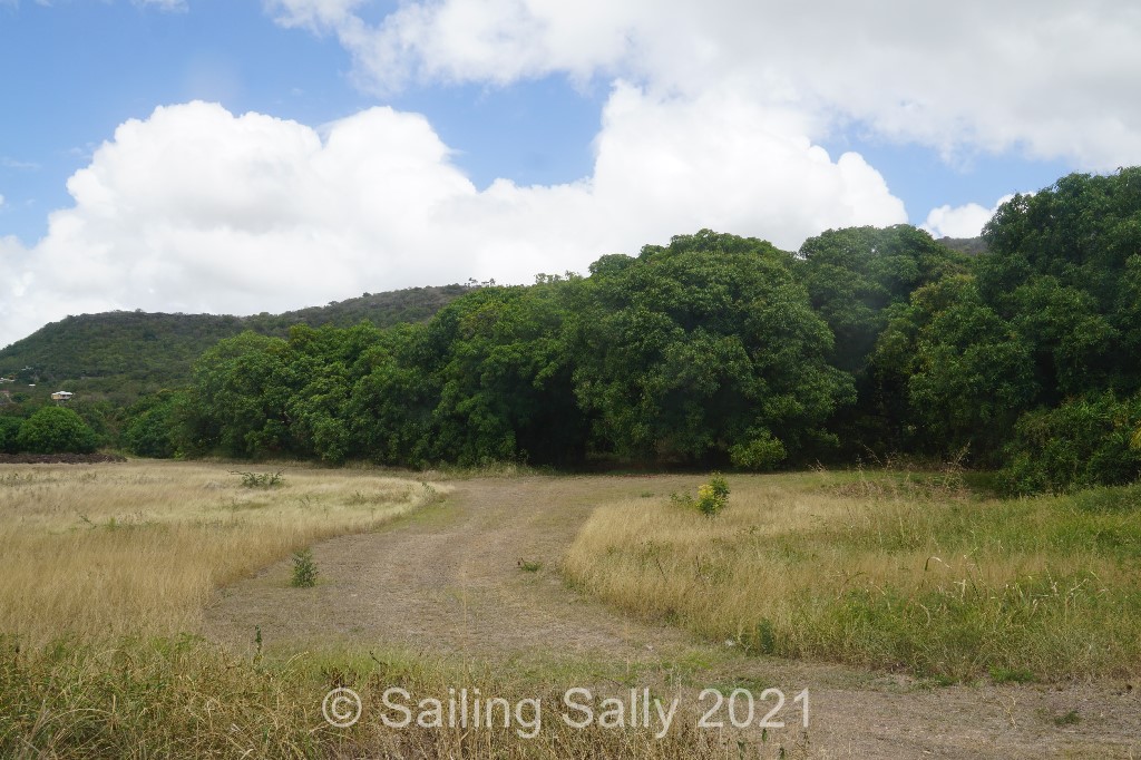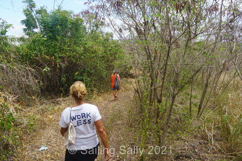 När vi tittar på kartan ser vi att vi måste gå tillbaka nästan ända till Catamaran Club. Det har varit en svettig promenad så här långt med mycket uppförsbacke. Efter några hundra meter hittar vi en möjlig genväg mot som vi tar. I såna här lägen är det bra med karta i telefonen, det gjorde att vi inte gick vilse mellan odlingarna och de enstaka hus som finns här. Till sist hittar vi kustvägen från Falmouth Bay ut till Turtle Bay Beach.