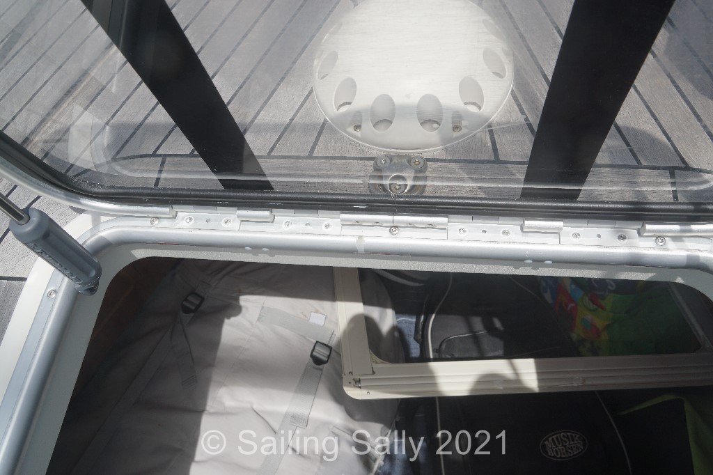 - Läckage i fördäcksluckan när vågorna spolar över fördäcket. Ny packning beställd hos Budget Marine i Falmouth Bay.