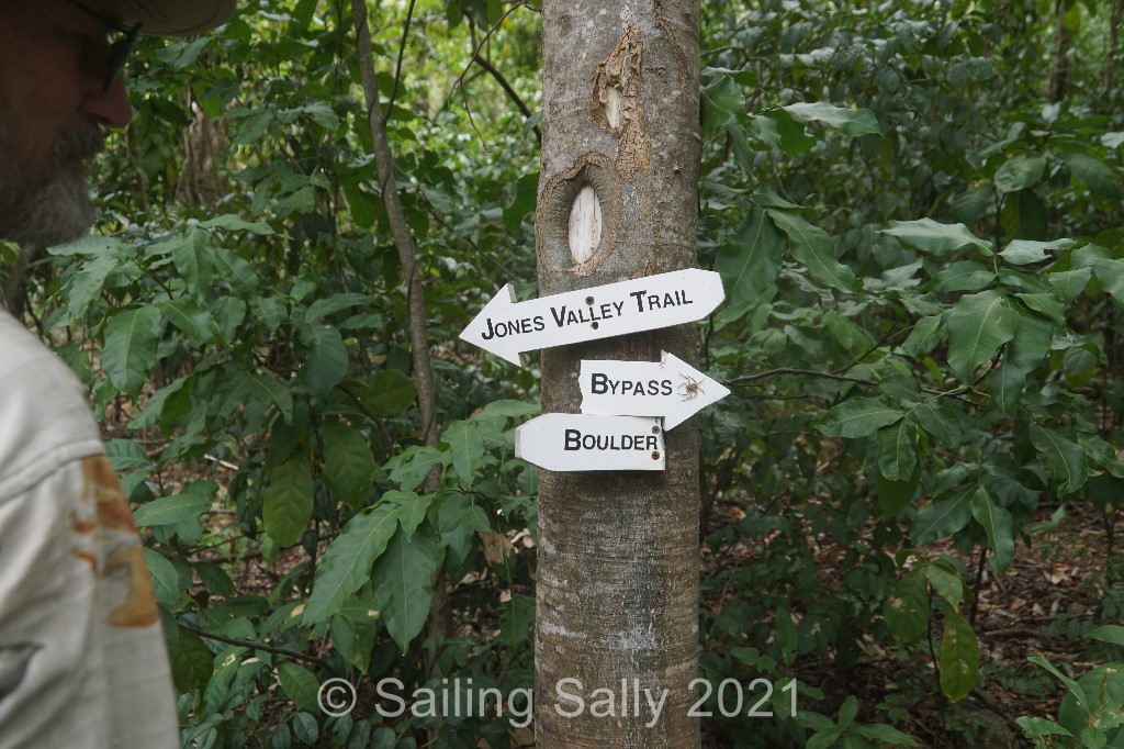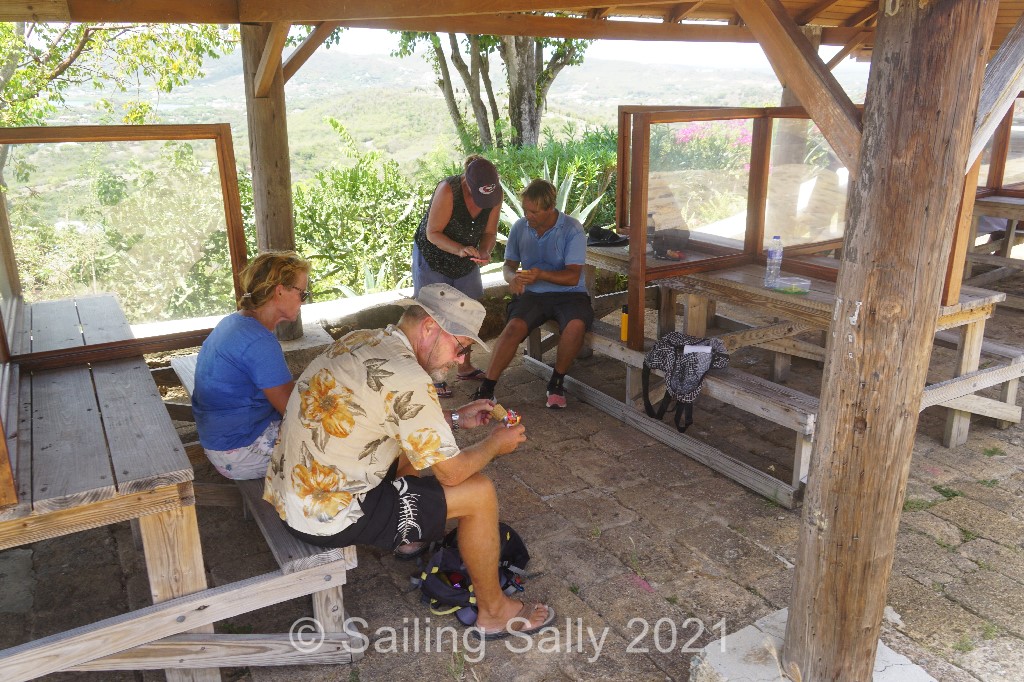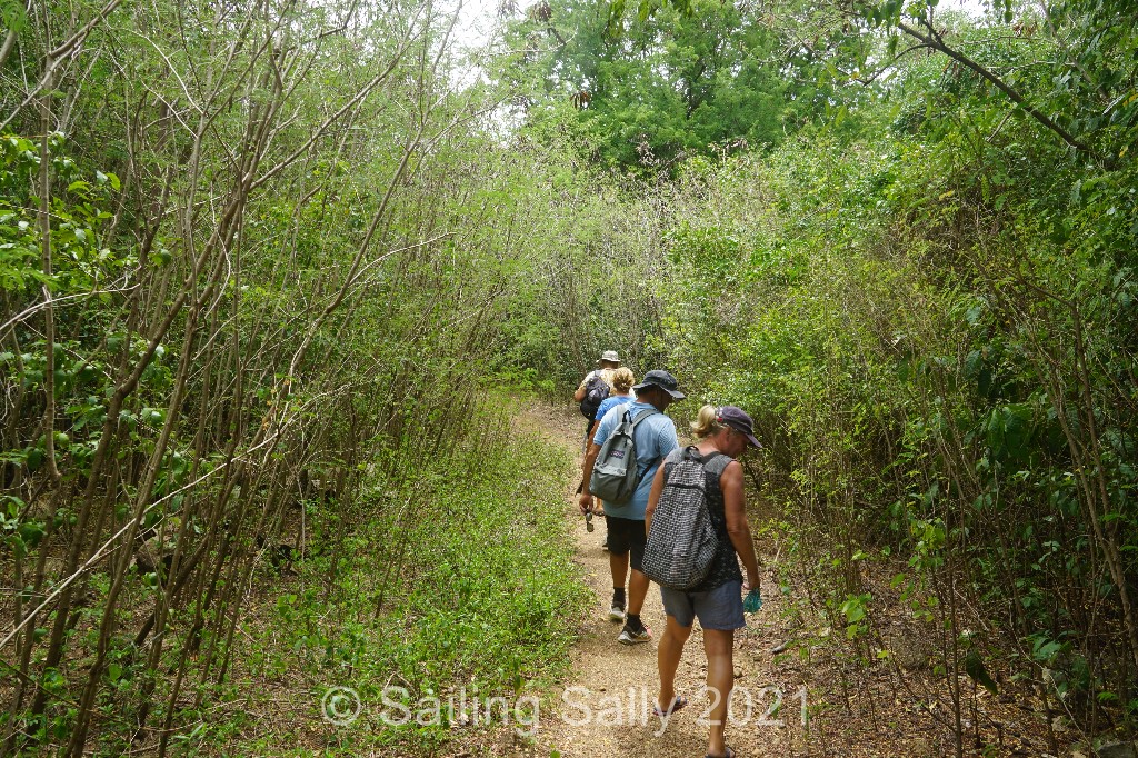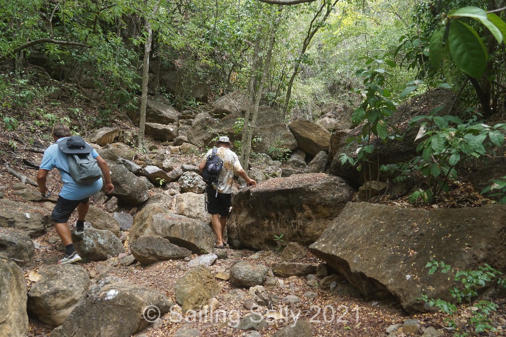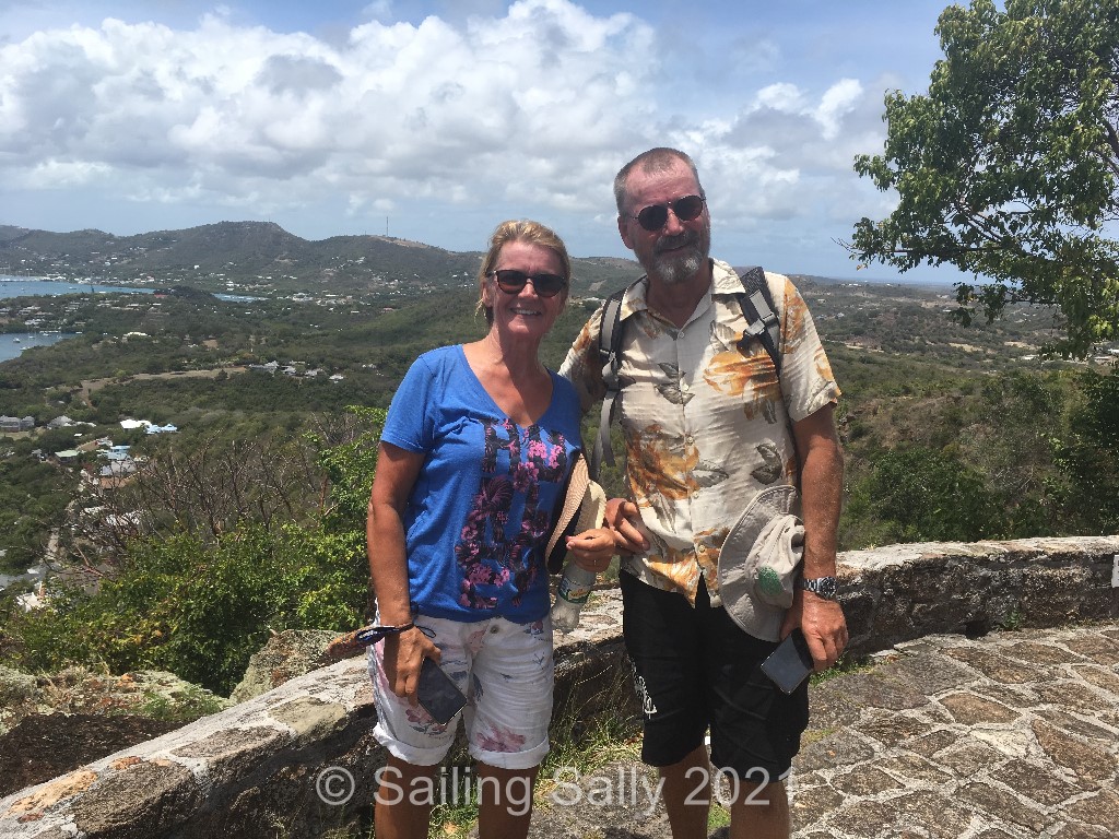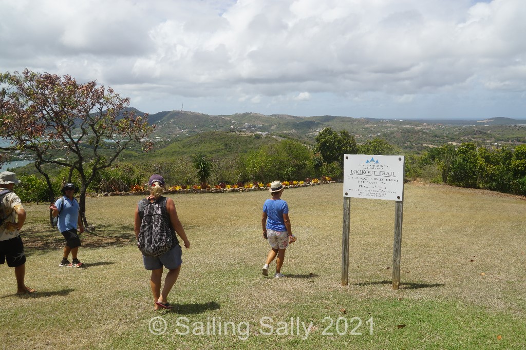 Öster om English Harbour finns ett högt berg med utsikt över den södra delen av Antigua och det är en lagom dagsvandring för oss. Vi gör sällskap med besättningarna på de svenska segelbåtarna Flying Penguin och Amaran. Första delen av sträckan går bland bebyggelsen kring English Harbour med en del rätt branta vägar både uppåt och neråt. Det går bilväg hela vägen upp till Shirley Hights, men det finns även en markerad vandringsled (Jones Valley Trail) längs en flodfåra i skogen upp på berget till Shirley Hights. Vi väljer vandringsleden för att slippa biltrafik och få skugga av träden. Flodfåran är nästan helt tom på vatten vilket underlättar vandringen, på vissa ställen försvåras klättringen av stora stenblock vi måste ta oss över eller runt.