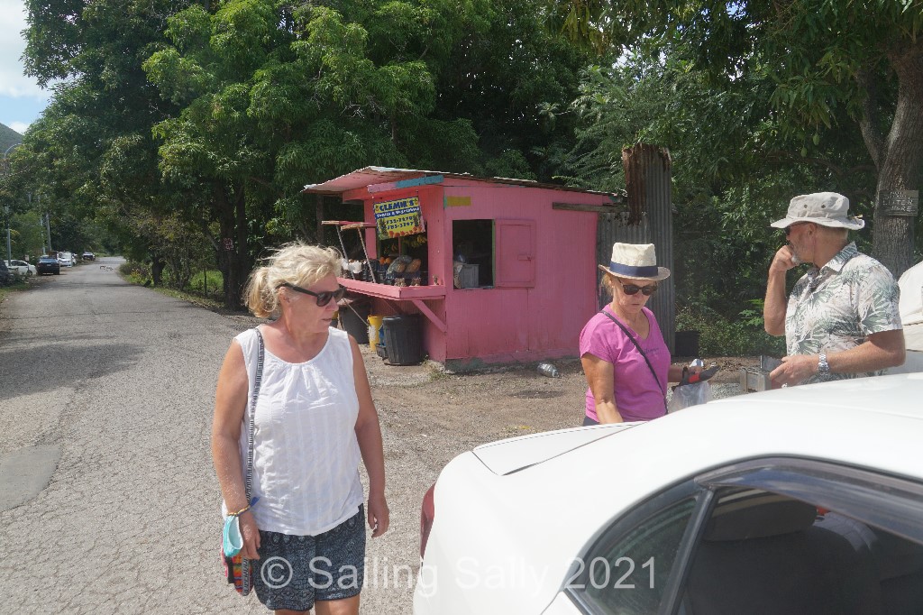 Efter lunch är vi redo för nya äventyr och efter lite kartstudier om vad som kanske kan vara intressant att upptäcka bestämmer vi oss för att ta vägen över bergen (Fig Tree Drive) ner mot den södra kusten och sen köra Old Road mot Jolly Harbour. Fig Tree Drive ringlar sig över bergen och genom skogen på södra Antigua. Fågelvägen är det bara några kilometer, men på en smal, krokig och illa underhållen väg känns det mycket längre. Vi har hört att de säljer ”Black Pinapple” efter den här vägen och vi hittar några sådana i en liten butik vid vägen. Det visar sig att de även säljer speciella kryddväxter och andra nyttigheter.