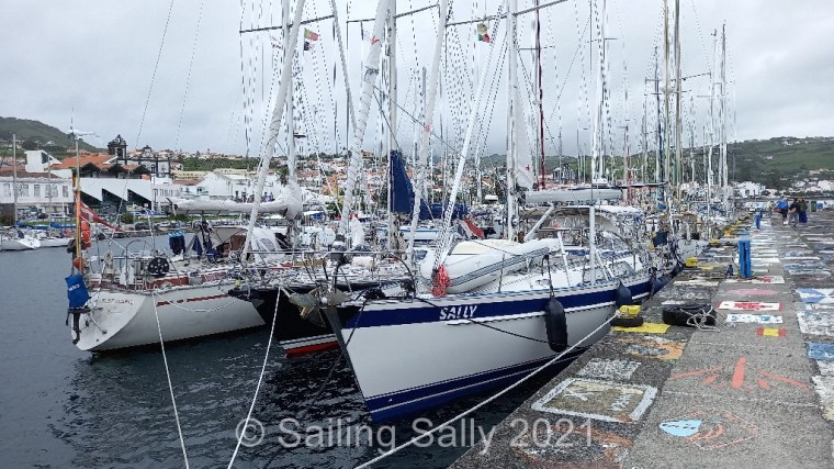 After about a week, several boats will leave Horta and continue to Europe or to other islands in the archipelago. So there will be a lot of boats moving and in the end, we ended up as the boat closest to the quay with two other boats on the outside. There is about a 60 cm difference between high and low tide, so long lengthwise mooring lines are required. The quay is protected with old truck tires and they are not kind to a white plastic boat, our own fenders turn black and then they leave black marks on the hull.