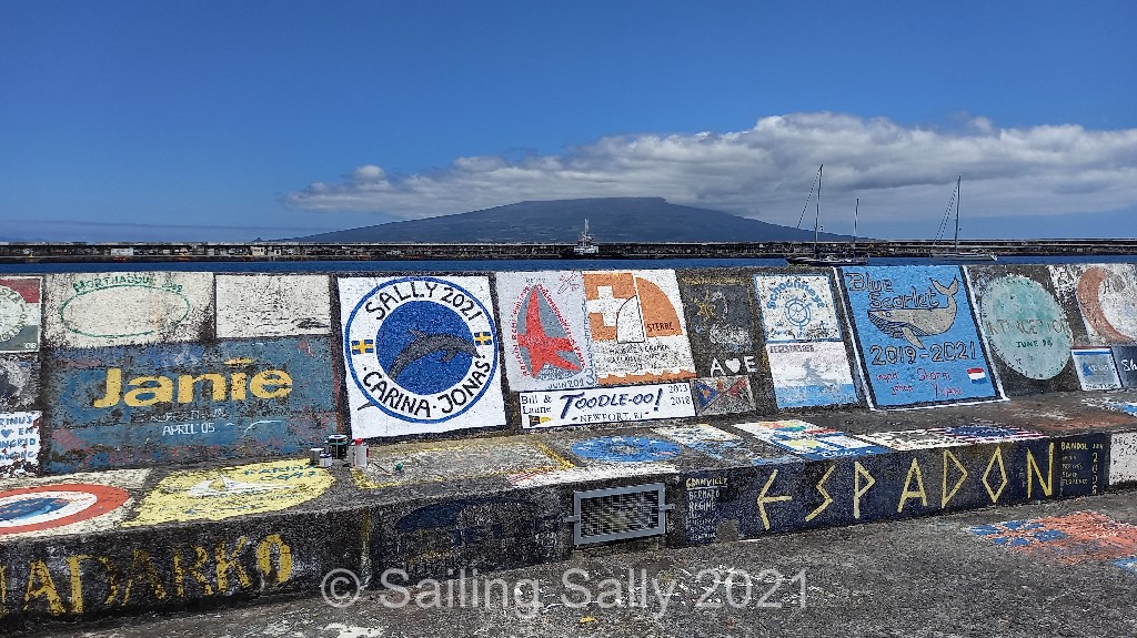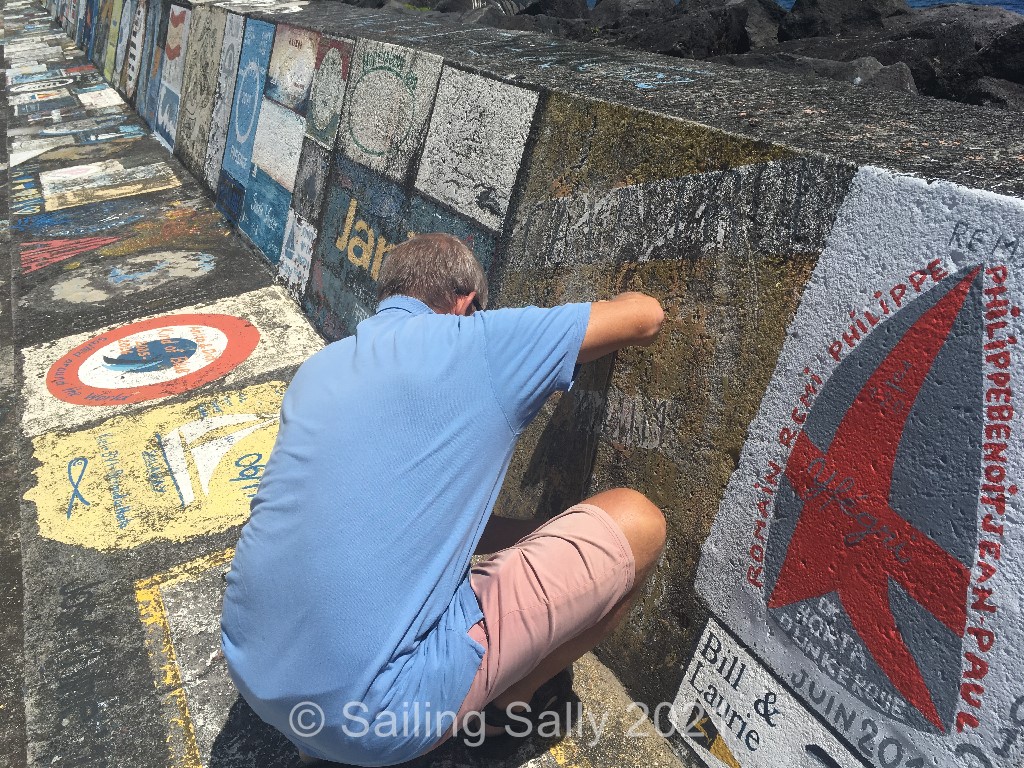 A tradition among sailors who are going or have crossed an ocean is to paint their boat name on the pier in the harbor. When we left Las Palmas we did not have time, but this time I felt I wanted to leave a trail behind us in Horta. The whole pier is already full of paintings, the oldest up to 20 years old and some are barely visible anymore. We found a place for our painting near where we were moored. I’m quite happy with the result. Wondering how long it will last.